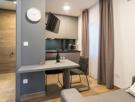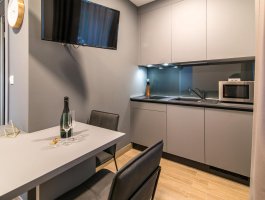 Studio (sve u jednoj prostoriji) : bračni krevet, kuhinjska niša, posuđe za kuhanje te pribor za jelo u apartmanu, kuhinjske krpe na raspolaganju, hladnjak sa zamrzivačem, električni štednjak, filter aparat za kavu, mikrovalna, glačalo, SAT-TV, pločice.