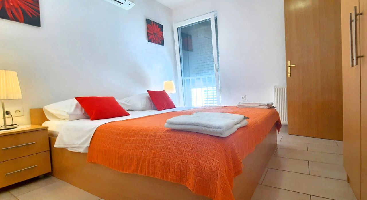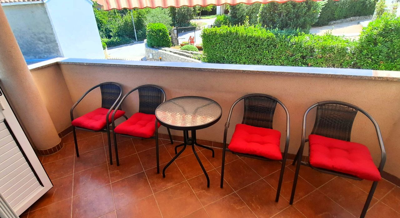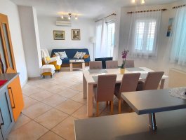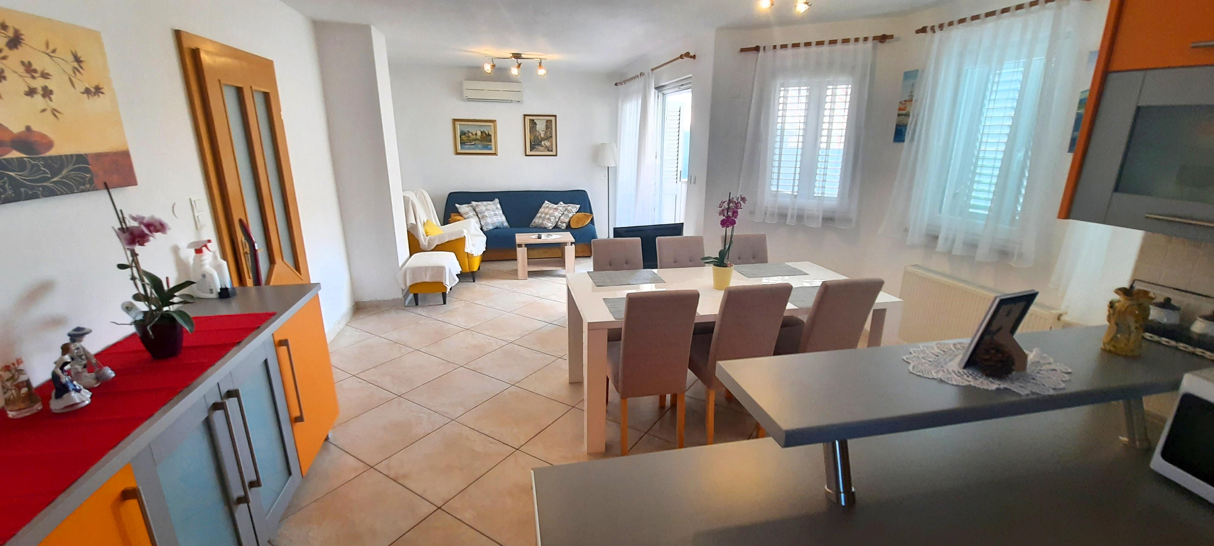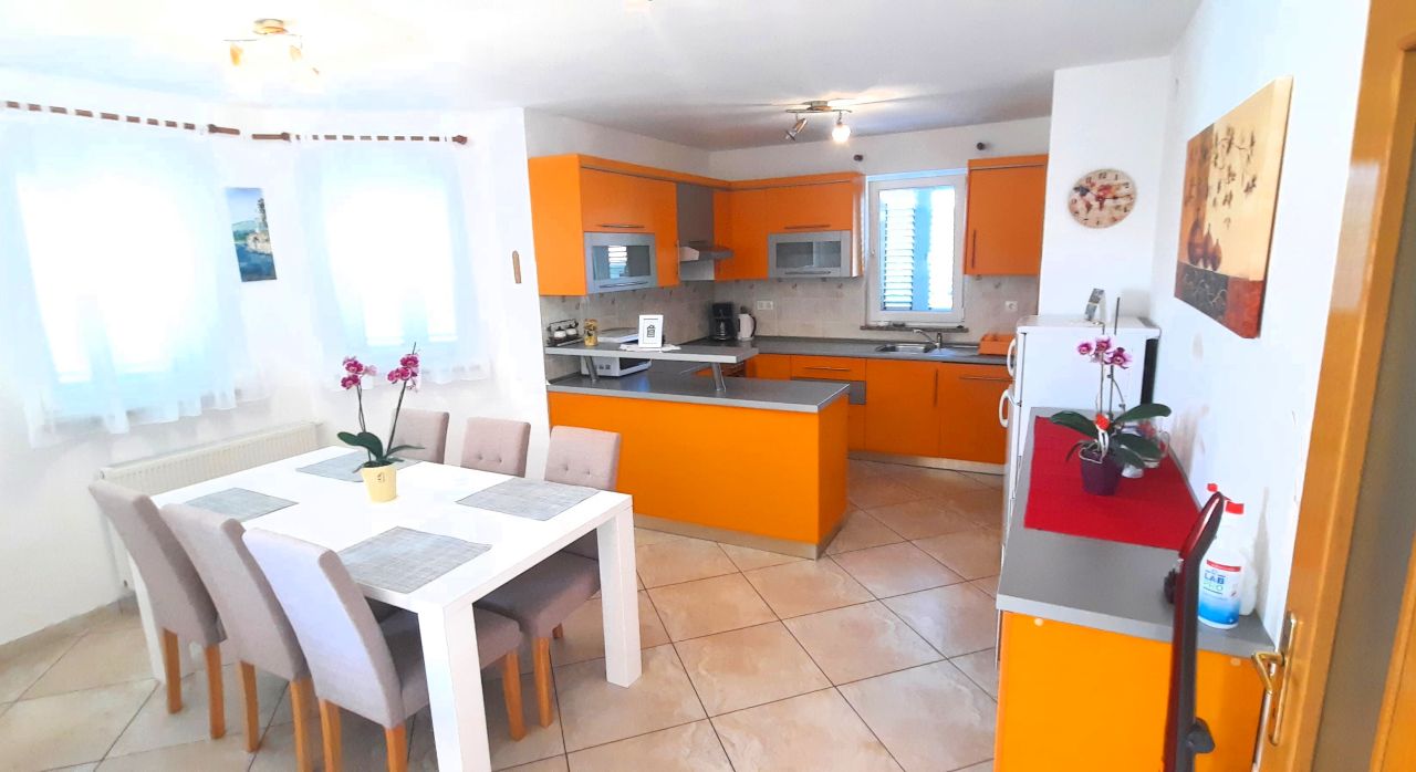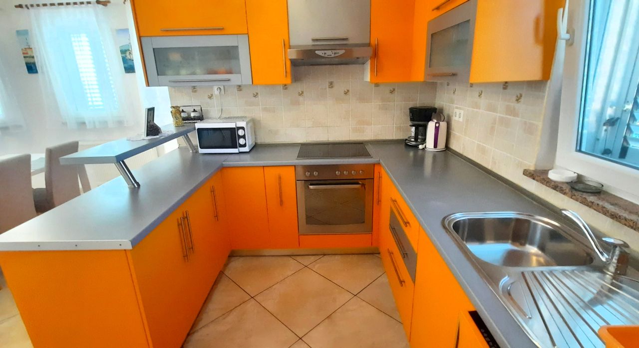 Kuhinja : kuhinjska niša, stol i stolice za sve osobe, posuđe za kuhanje te pribor za jelo u apartmanu, kuhinjske krpe uključene, električni štednjak, pećnica, hladnjak sa zamrzivačem, filter aparat za kavu, perilica suđa.