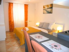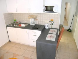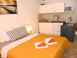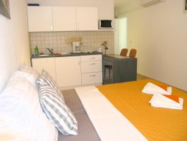 Studio (sve u jednoj prostoriji) : bračni krevet, stol i stolice za sve osobe, kuhinjska niša, posuđe za kuhanje te pribor za jelo u apartmanu, kuhinjske krpe na raspolaganju, hladnjak bez zamrzivača, električni štednjak, filter aparat za kavu, mikrovalna, SAT-TV, pločice.