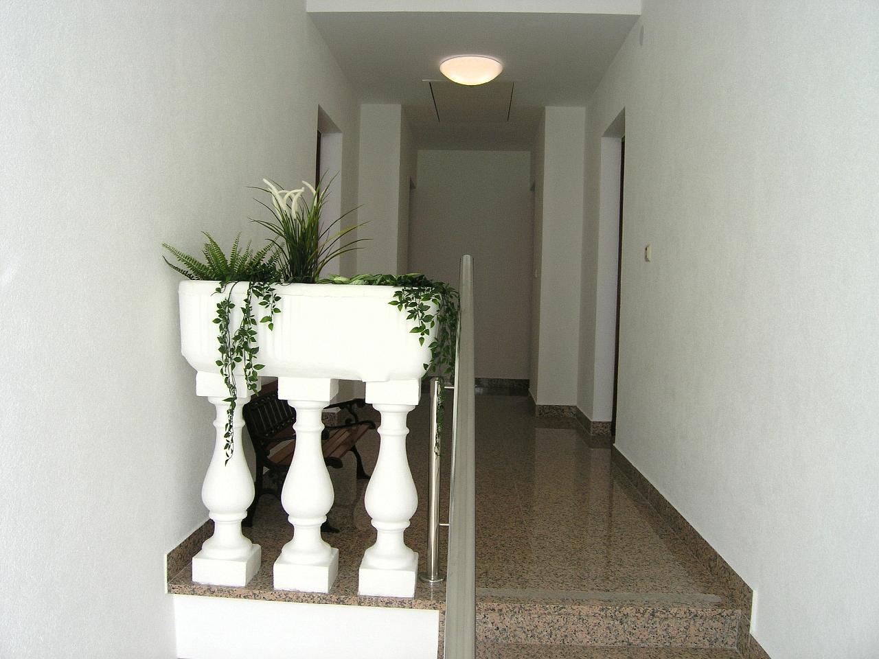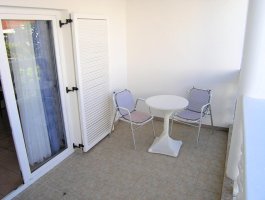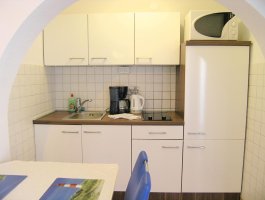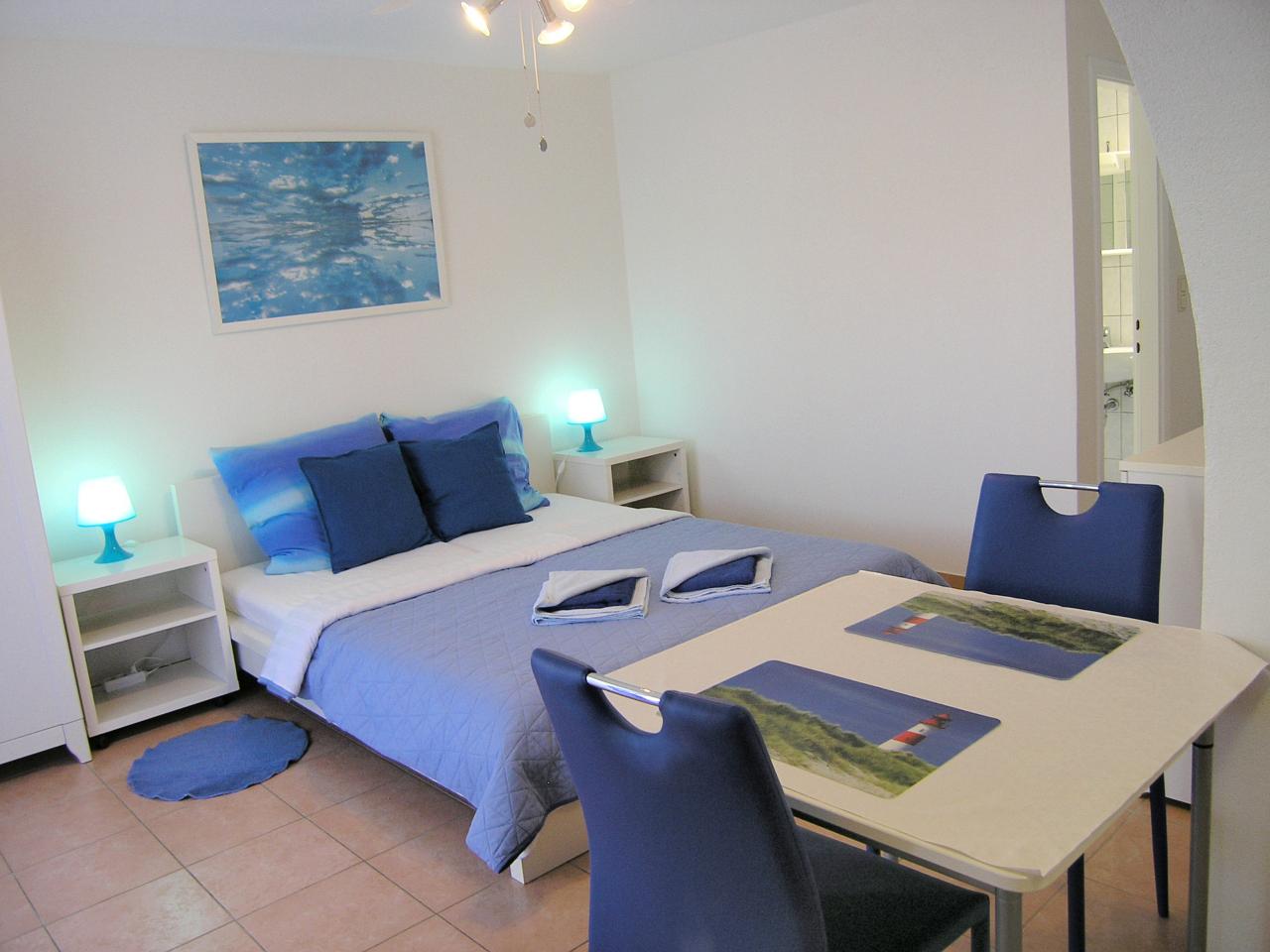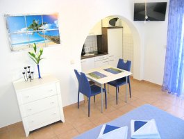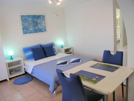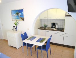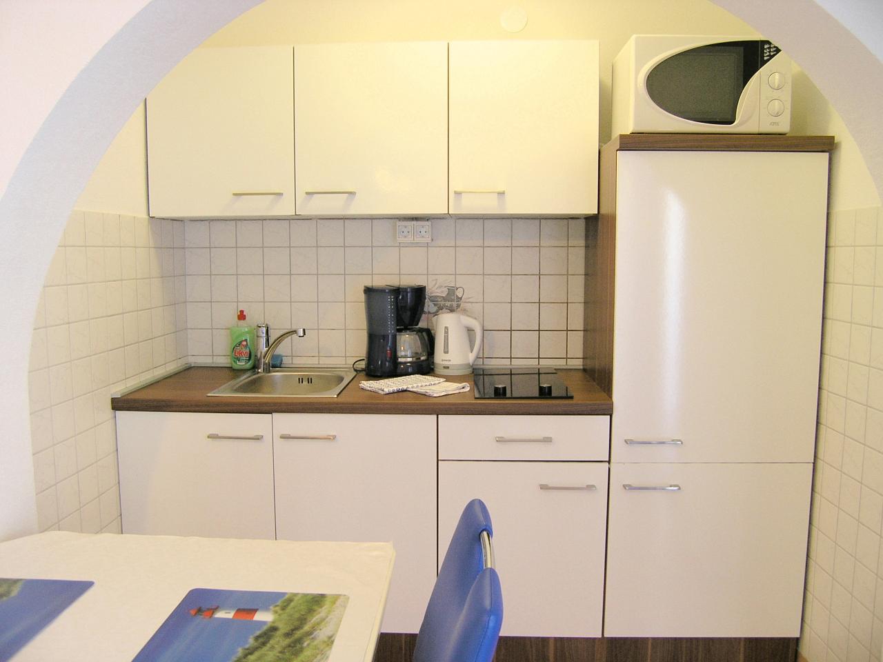 Studio (sve u jednoj prostoriji) : bračni krevet, s balkonom, kuhinjska niša, posuđe za kuhanje te pribor za jelo u apartmanu, kuhinjske krpe na raspolaganju, hladnjak s malim zamrzivačem, električni štednjak, filter aparat za kavu, mikrovalna, SAT-TV, pločice.