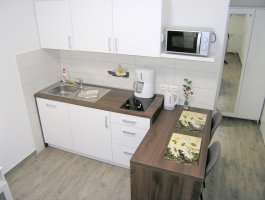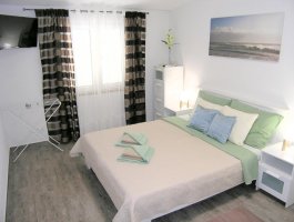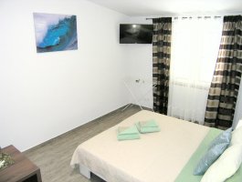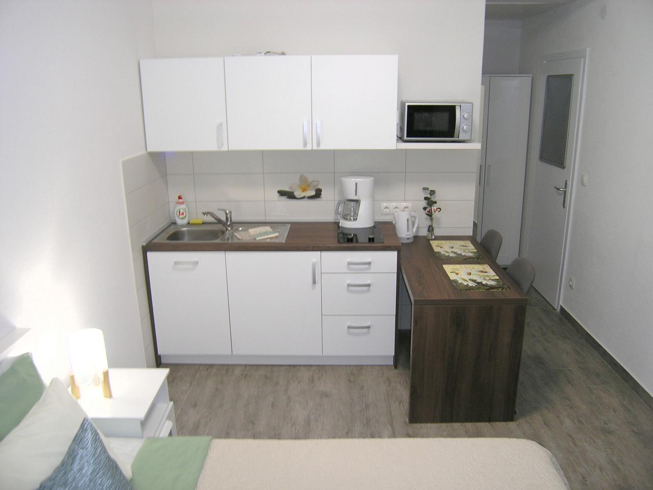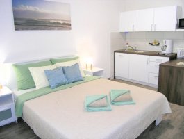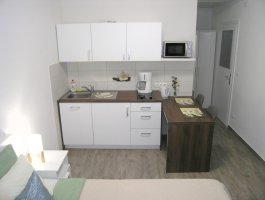 Studio (sve u jednoj prostoriji) : bračni krevet, stol i stolice za sve osobe, kuhinjska niša, posuđe za kuhanje te pribor za jelo u apartmanu, kuhinjske krpe na raspolaganju, hladnjak s malim zamrzivačem, električni štednjak, filter aparat za kavu, SAT-TV, pločice.