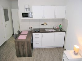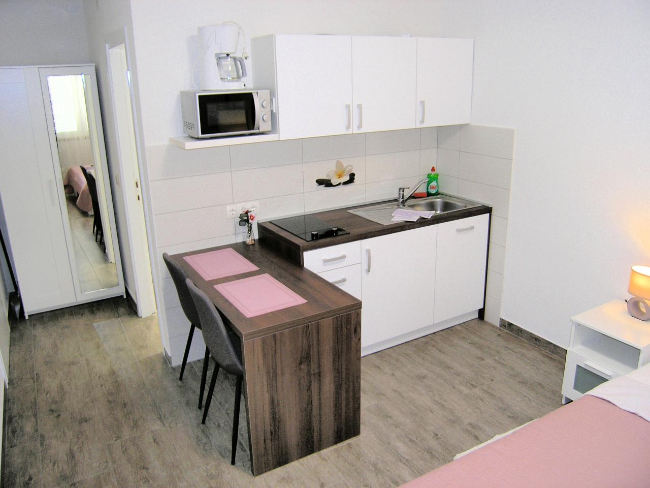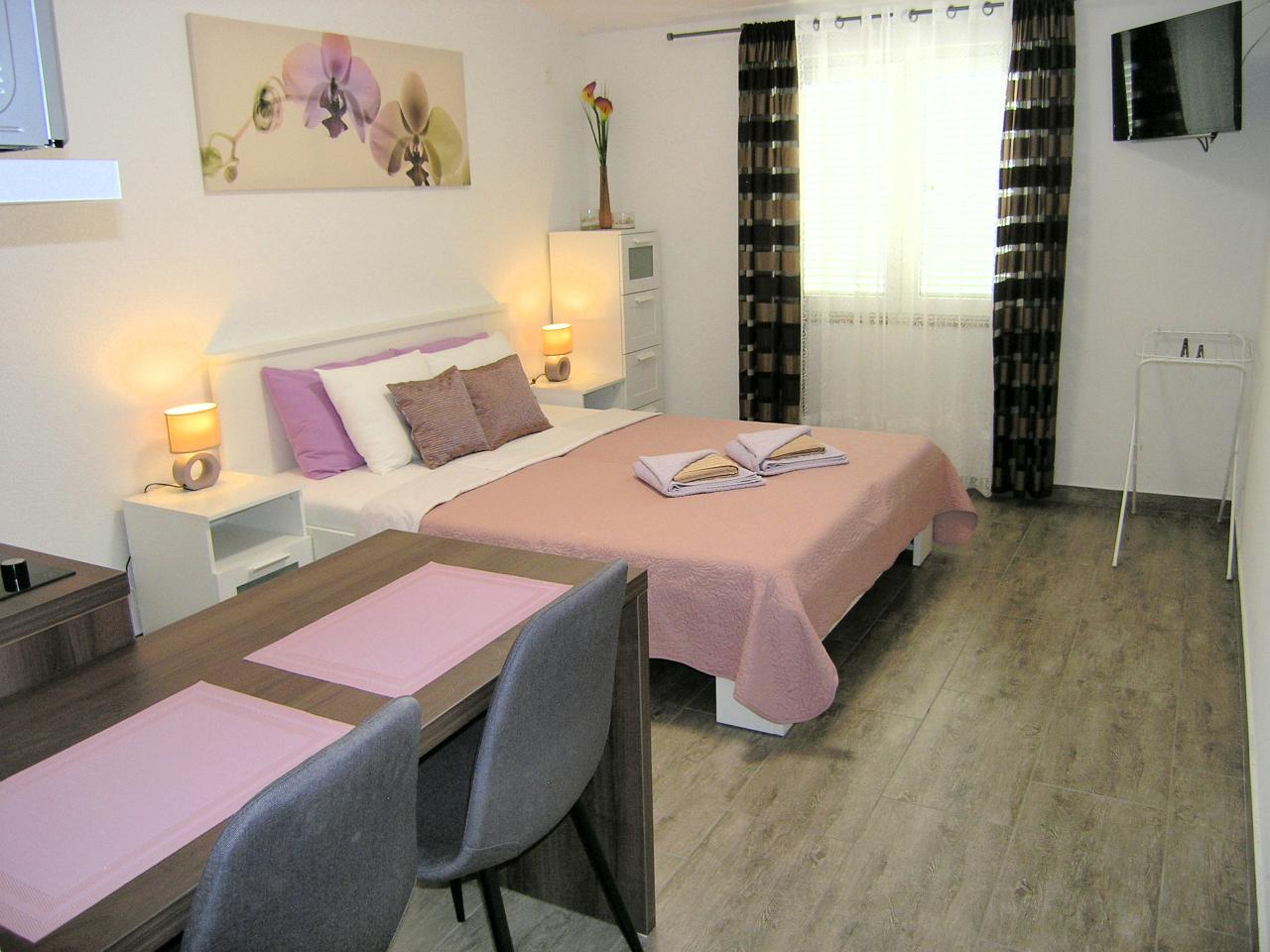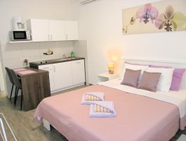 Studio (sve u jednoj prostoriji) : bračni krevet, stol i stolice za sve osobe, kuhinjska niša, posuđe za kuhanje te pribor za jelo u apartmanu, kuhinjske krpe na raspolaganju, hladnjak s malim zamrzivačem, električni štednjak, SAT-TV, pločice.