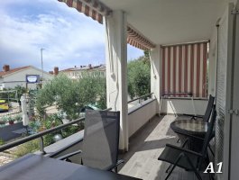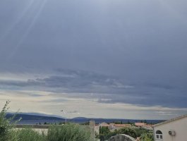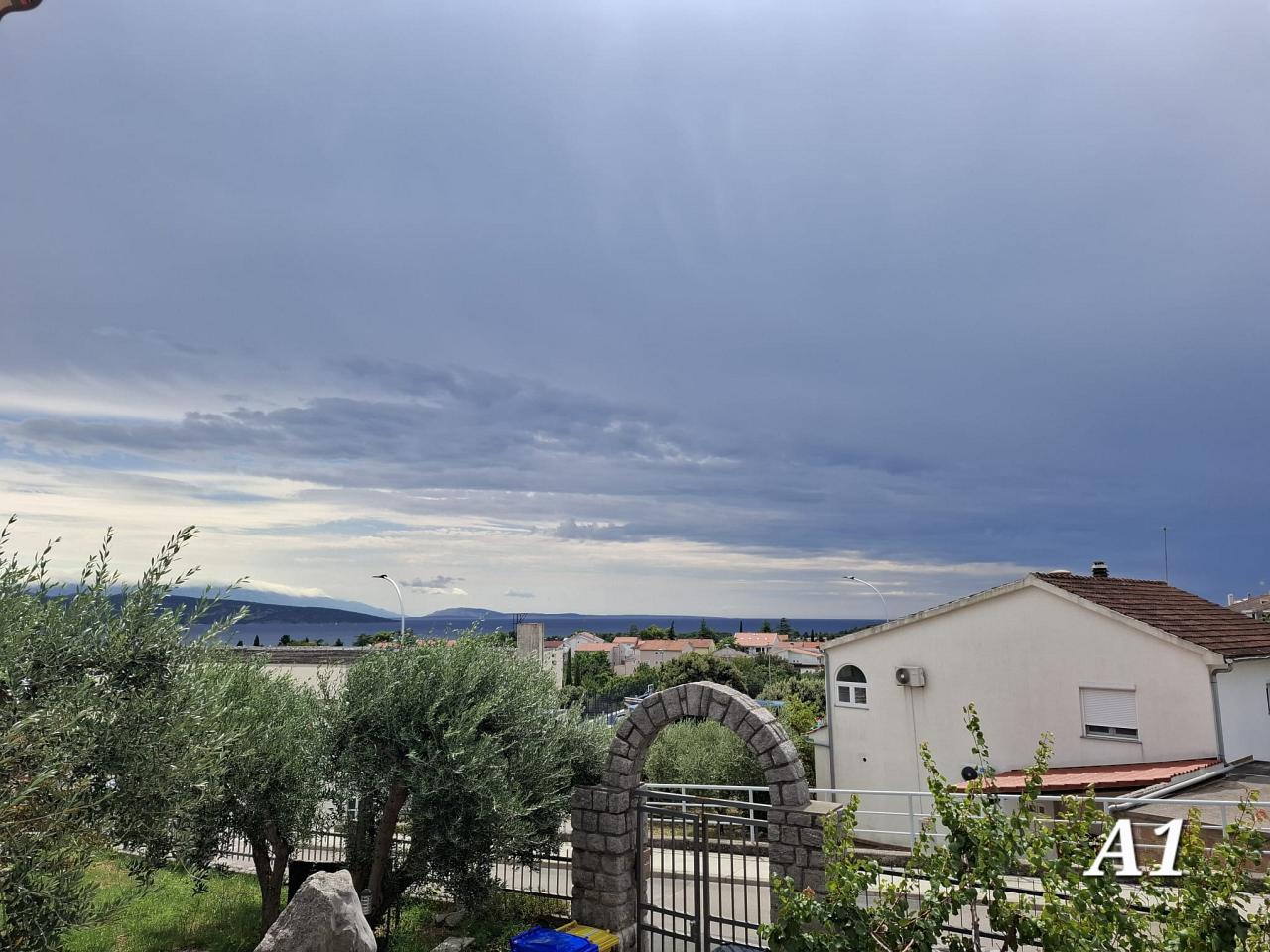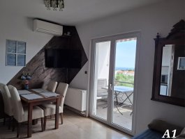 Dnevni boravak : dnevni boravak, blagovaonica i kuhinja su jedna prostorija, TV sat, pločice, balkon s pogledom na more.