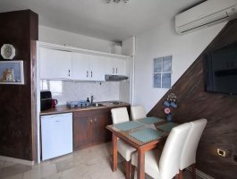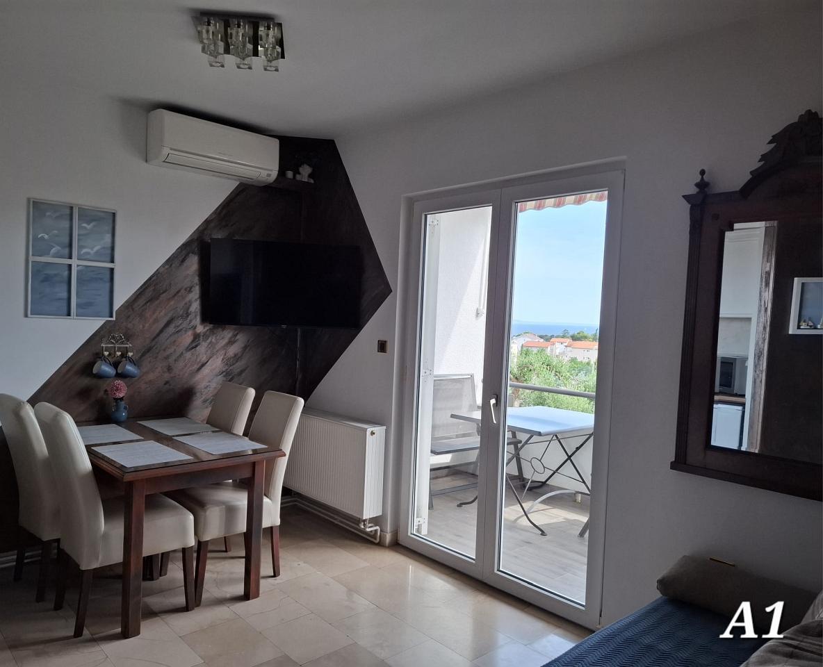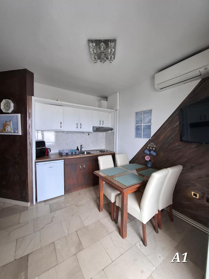 Kuhinja : kuhinjska niša, stol i stolice za sve osobe, posuđe za kuhanje te pribor za jelo u apartmanu, kuhinjske krpe uključene, električni štednjak, hladnjak s malim zamrzivačem, filter aparat za kavu, mikrovalna.