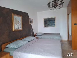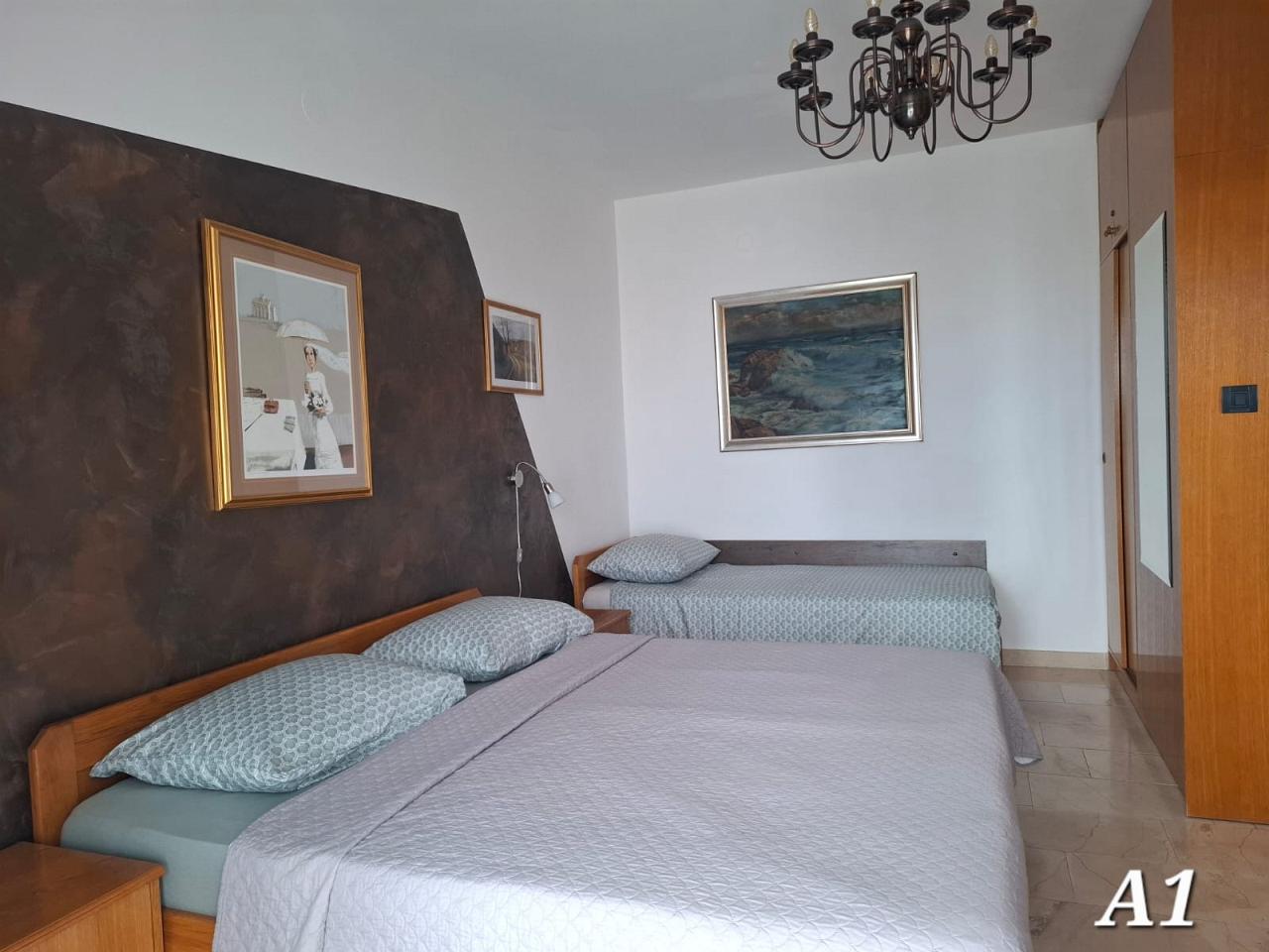 Spavaća soba : trokrevetna soba, bračni krevet, jedan pomoćni ležaj, pločice, krevetnina se mijenja svakih 7 dana.
