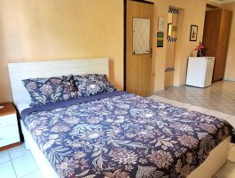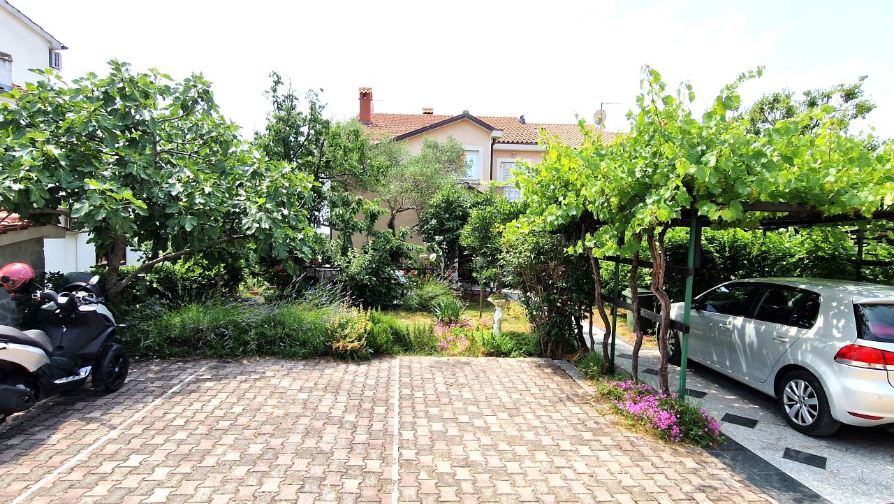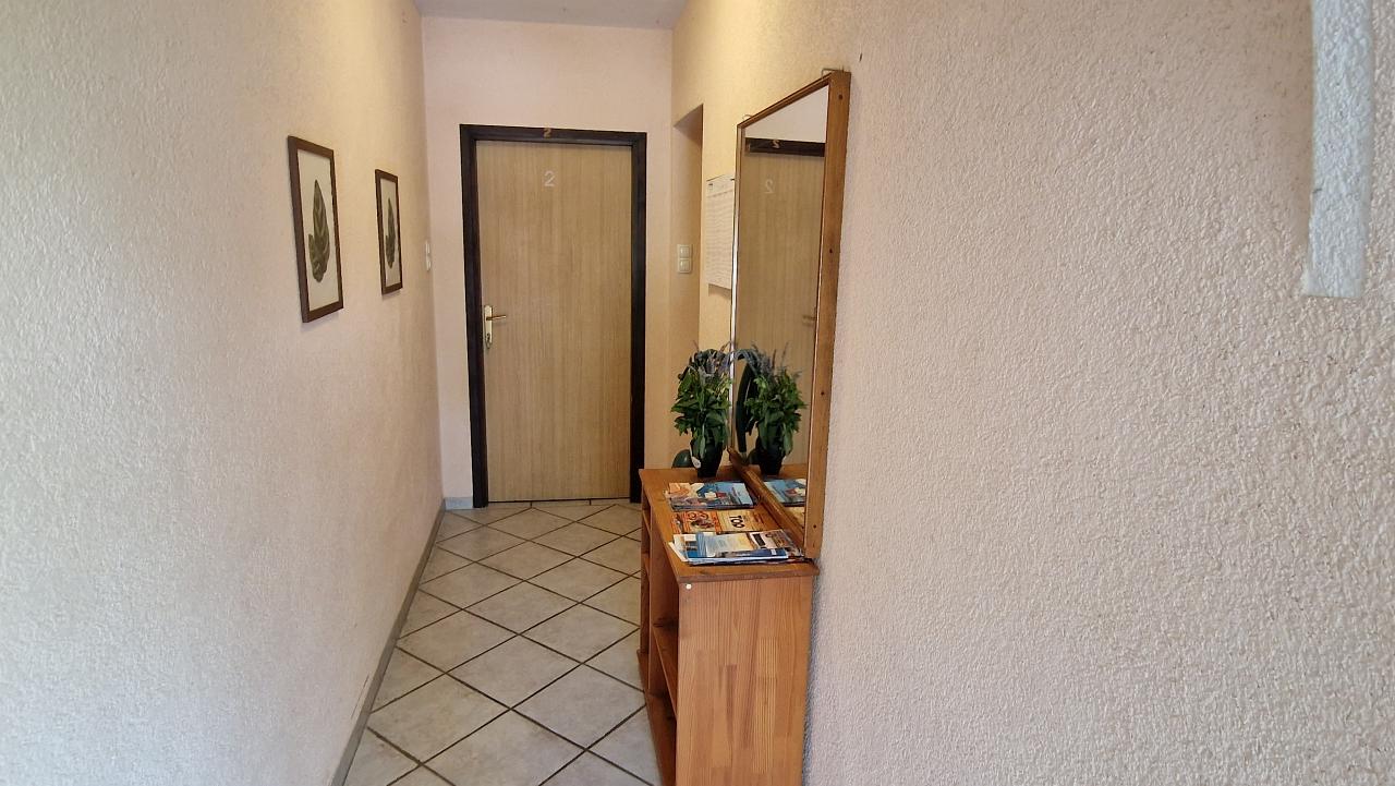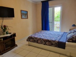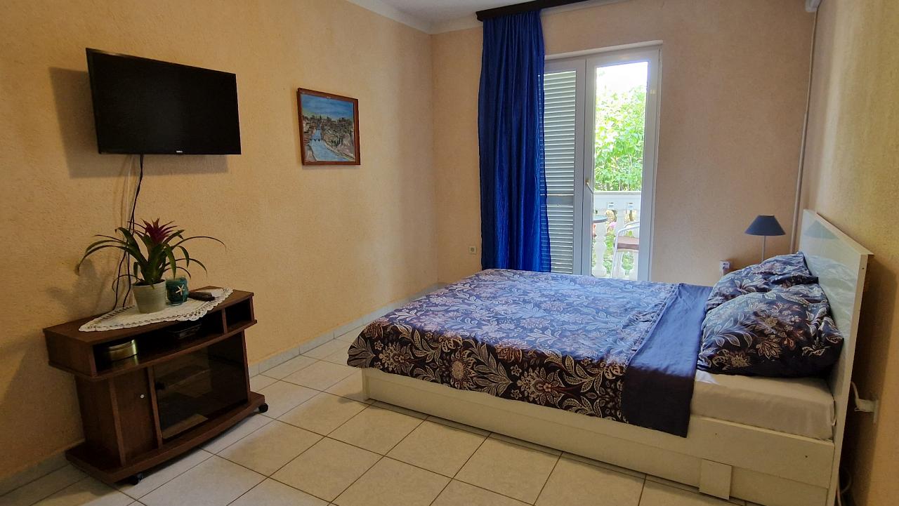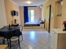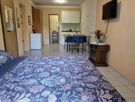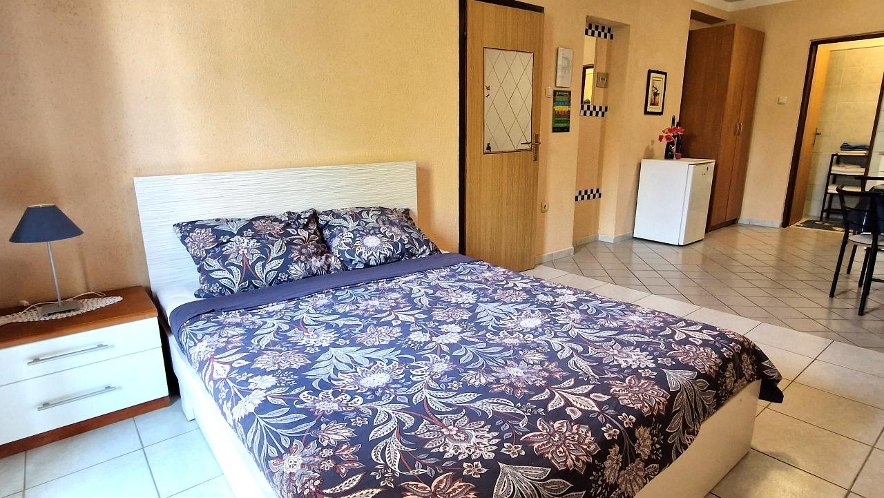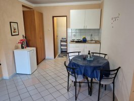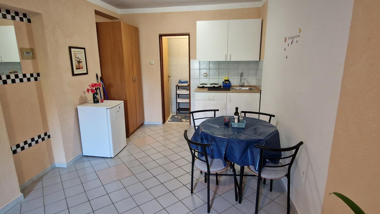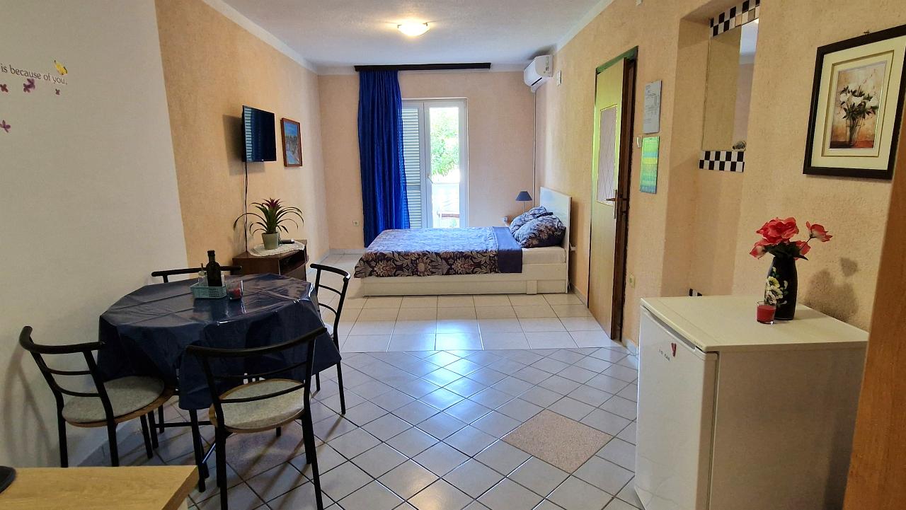 Studio (sve u jednoj prostoriji) : bračni krevet, s balkonom, s terasom, stol i stolice za sve osobe, kuhinjska niša, posuđe za kuhanje te pribor za jelo u apartmanu, kuhinjske krpe na raspolaganju, hladnjak s malim zamrzivačem, električni štednjak, filter aparat za kavu, SAT-TV, pločice.