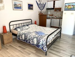 Studio (sve u jednoj prostoriji) : bračni krevet, s terasom, stol i stolice za sve osobe, kuhinjska niša, perilica za suđe, posuđe za kuhanje te pribor za jelo u apartmanu, kuhinjske krpe na raspolaganju, hladnjak s malim zamrzivačem, električni štednjak, filter aparat za kavu, SAT-TV, laminat.