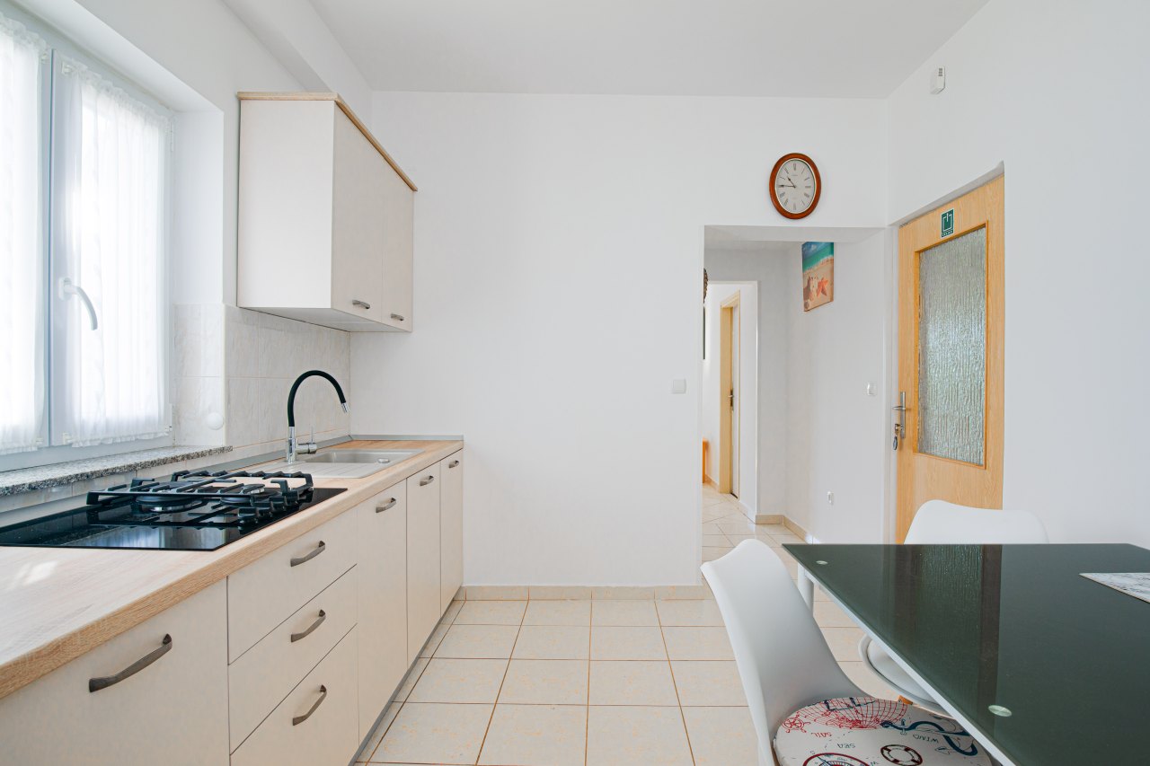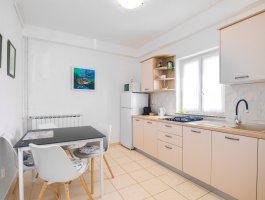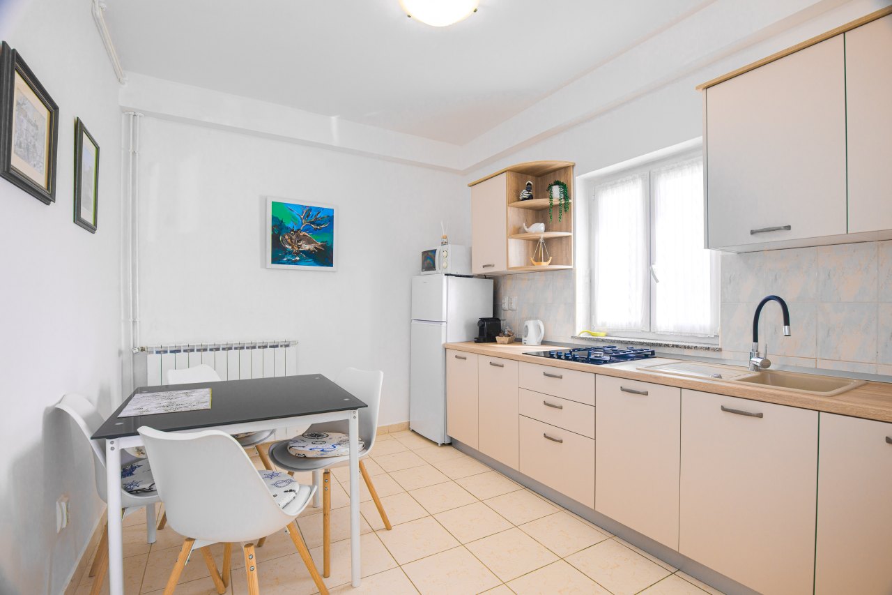 Kuhinja : stol i stolice za sve osobe, posuđe za kuhanje te pribor za jelo u apartmanu, kuhinjske krpe uključene, električni i plinski štednjak, perilica za suđe, mikrovalna, toster, kuhalo za vodu, aparat za kavu.