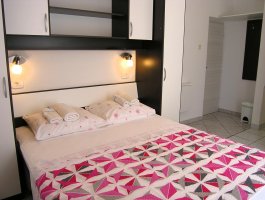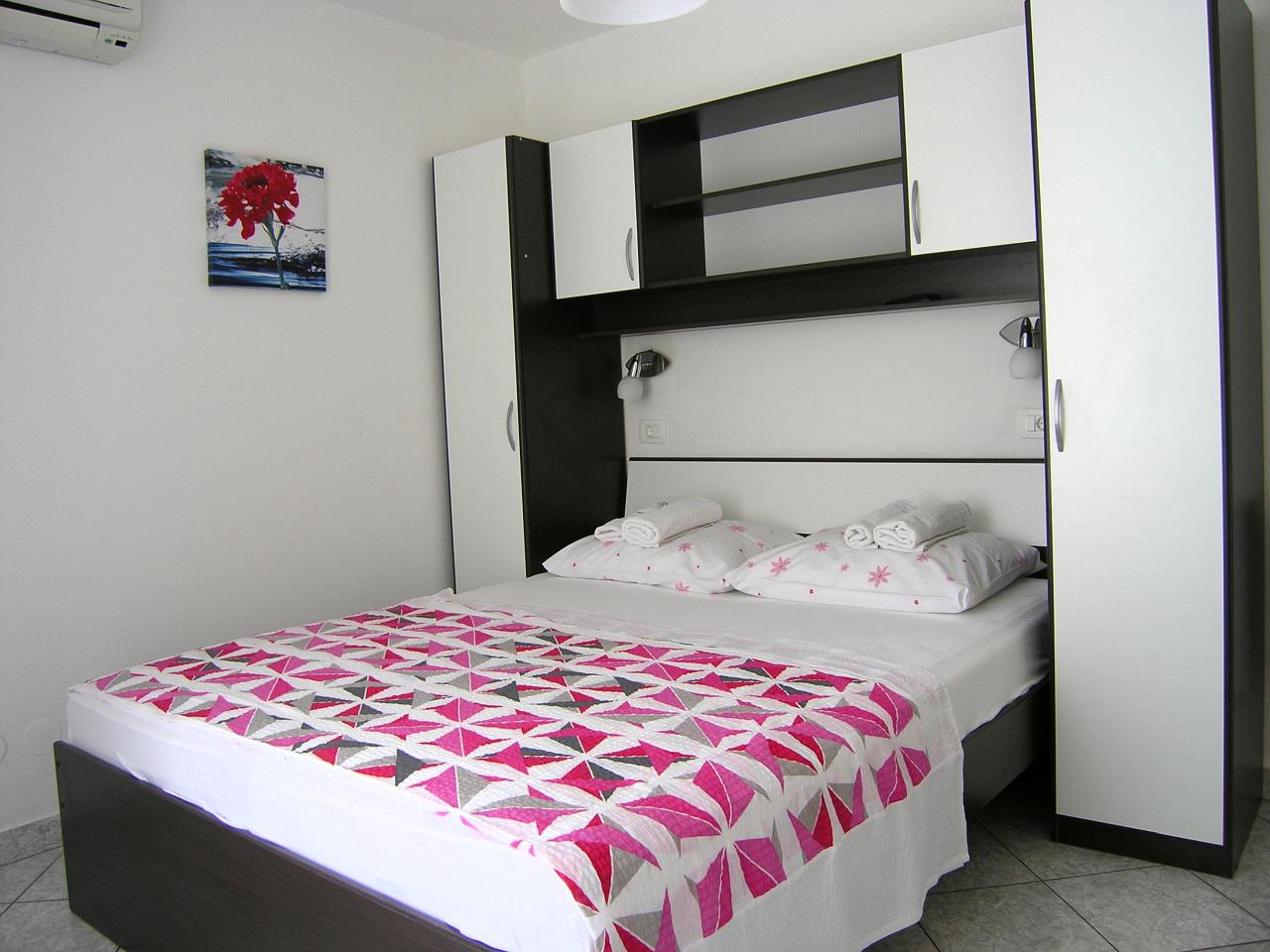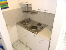 Studio (sve u jednoj prostoriji) : bračni krevet, s balkonom, s pogledom na more, stol i stolice za sve osobe, kuhinjska niša, posuđe za kuhanje te pribor za jelo u apartmanu, kuhinjske krpe na raspolaganju, hladnjak bez zamrzivača, električni štednjak, filter aparat za kavu, SAT-TV, pločice.