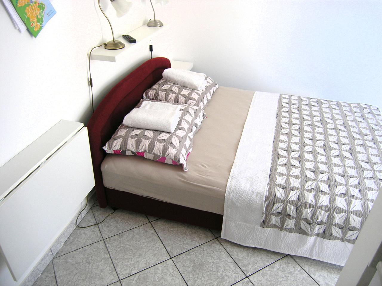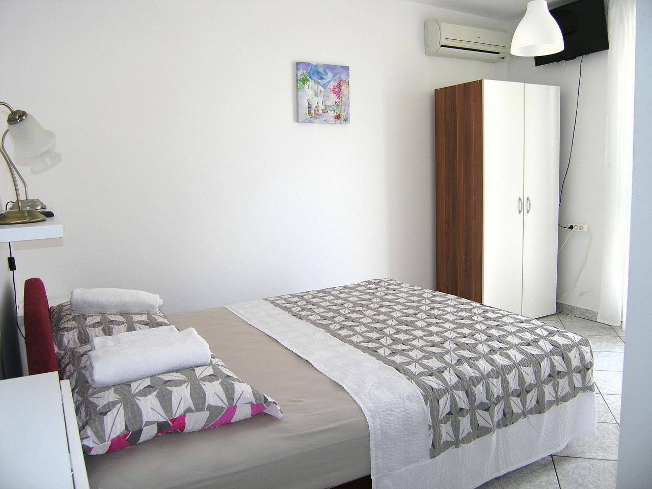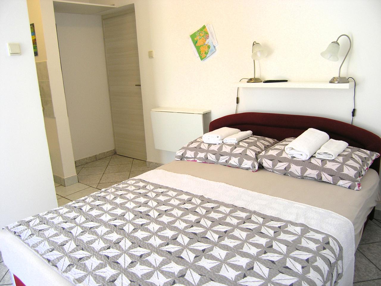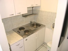 Studio (sve u jednoj prostoriji) : bračni krevet, s balkonom, s pogledom na more, stol i stolice za sve osobe, kuhinjska niša, posuđe za kuhanje te pribor za jelo u apartmanu, kuhinjske krpe na raspolaganju, hladnjak bez zamrzivača, električni štednjak, filter aparat za kavu, SAT-TV, pločice.