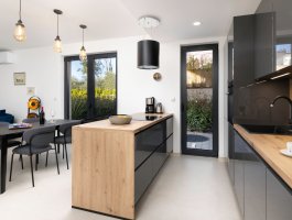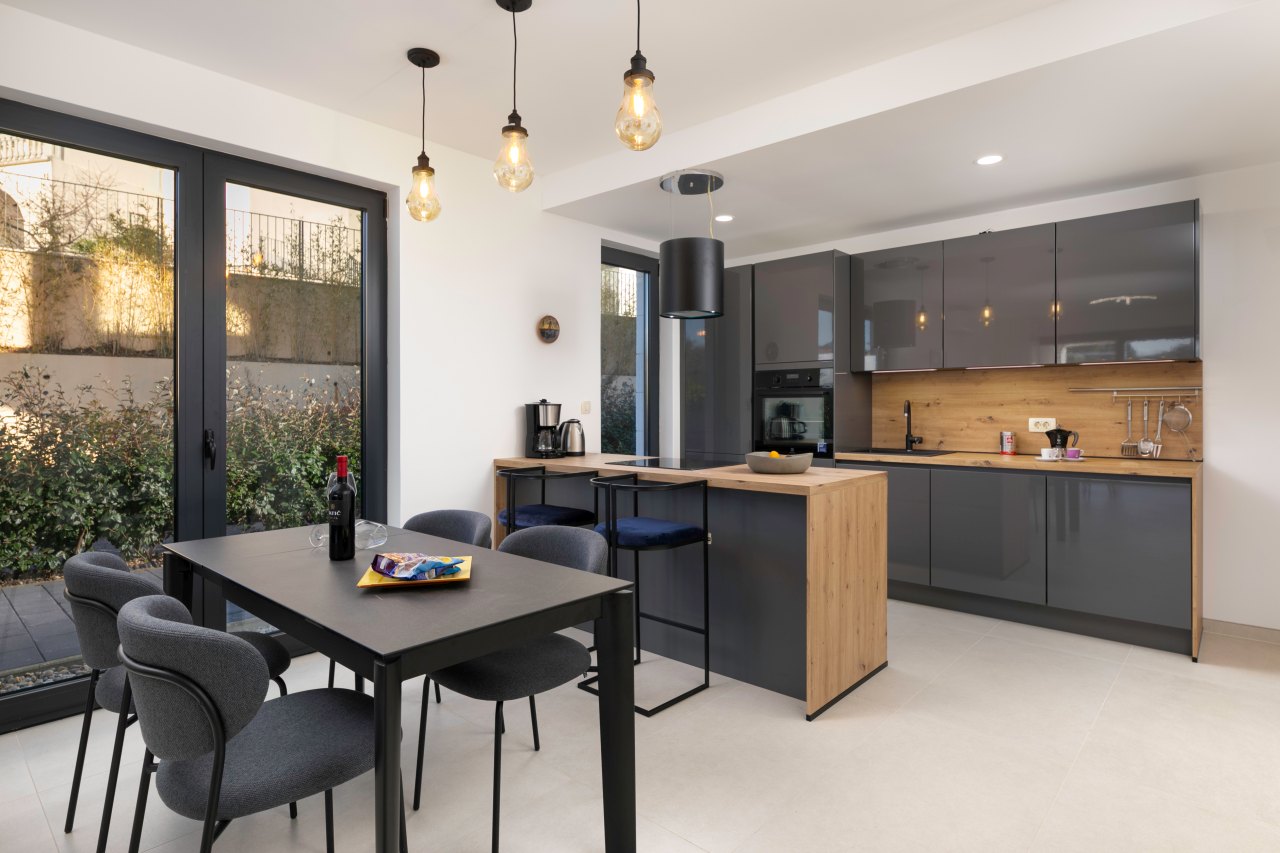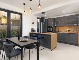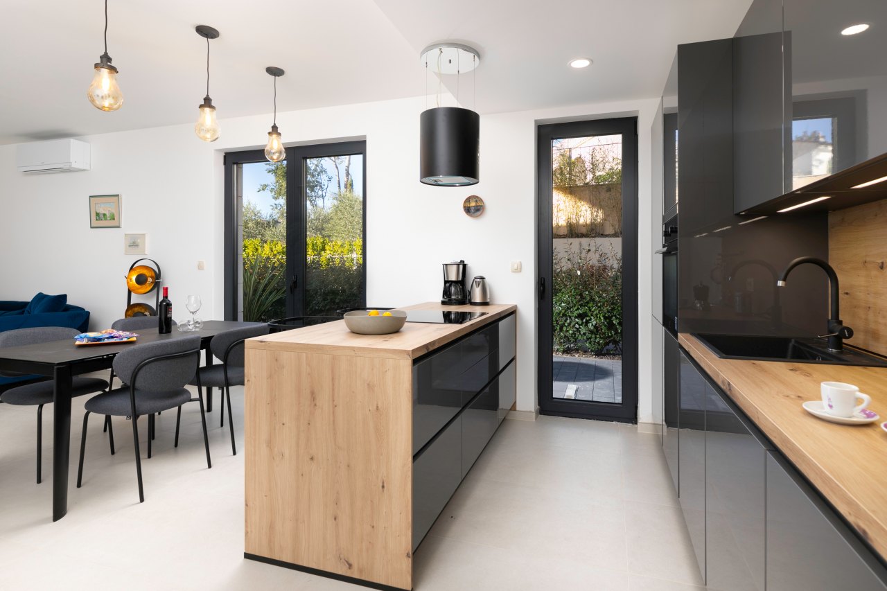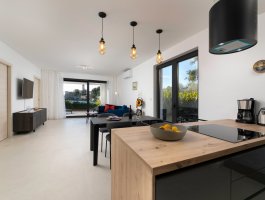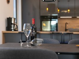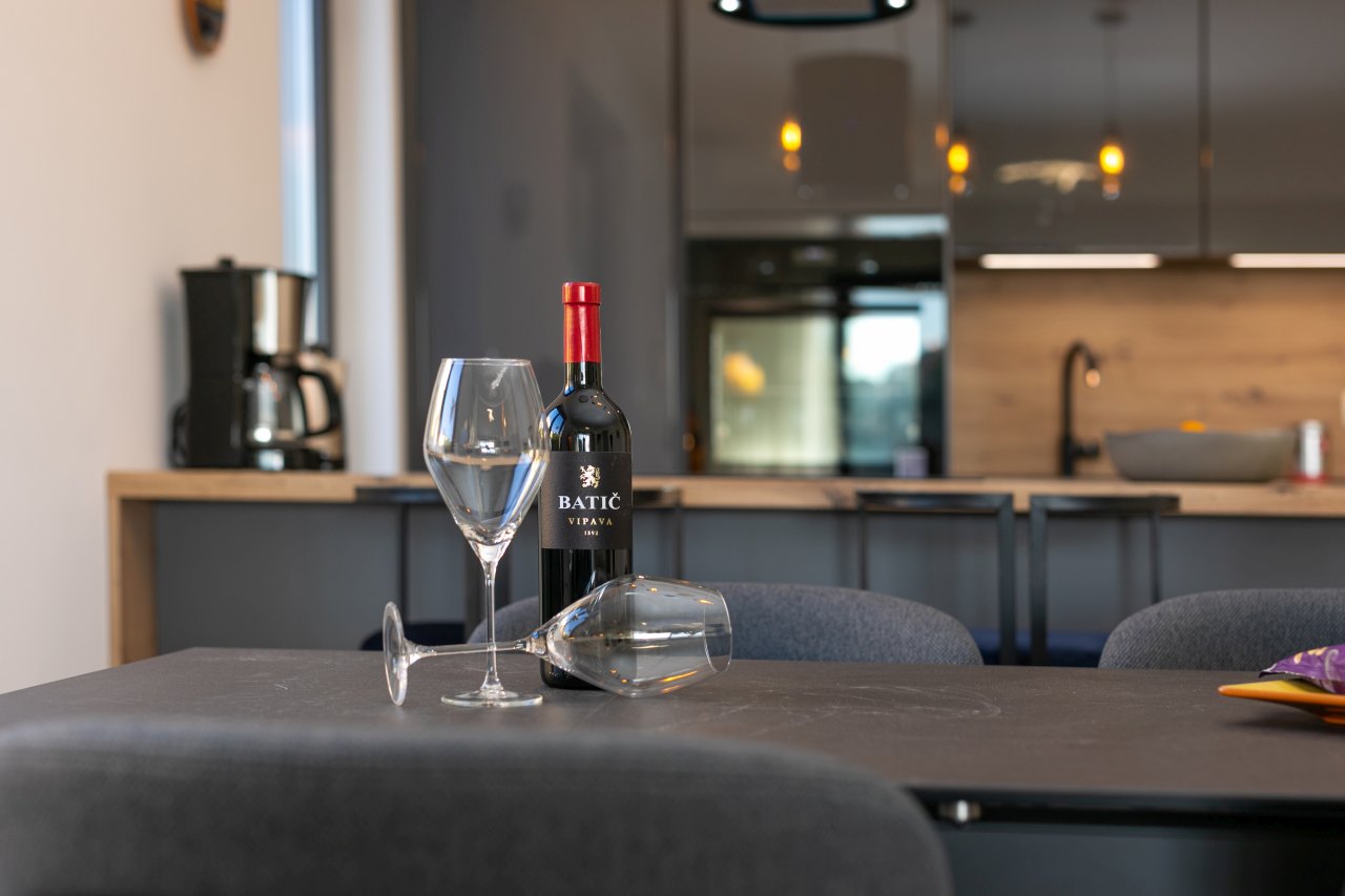 Kuhinja : kuhinjska niša, stol i stolice za sve osobe, posuđe za kuhanje te pribor za jelo u apartmanu, kuhinjske krpe uključene, električni štednjak, pećnica, hladnjak sa zamrzivačem, filter aparat za kavu, toster, kuhalo za vodu, perilica suđa.