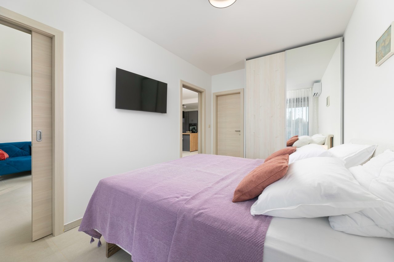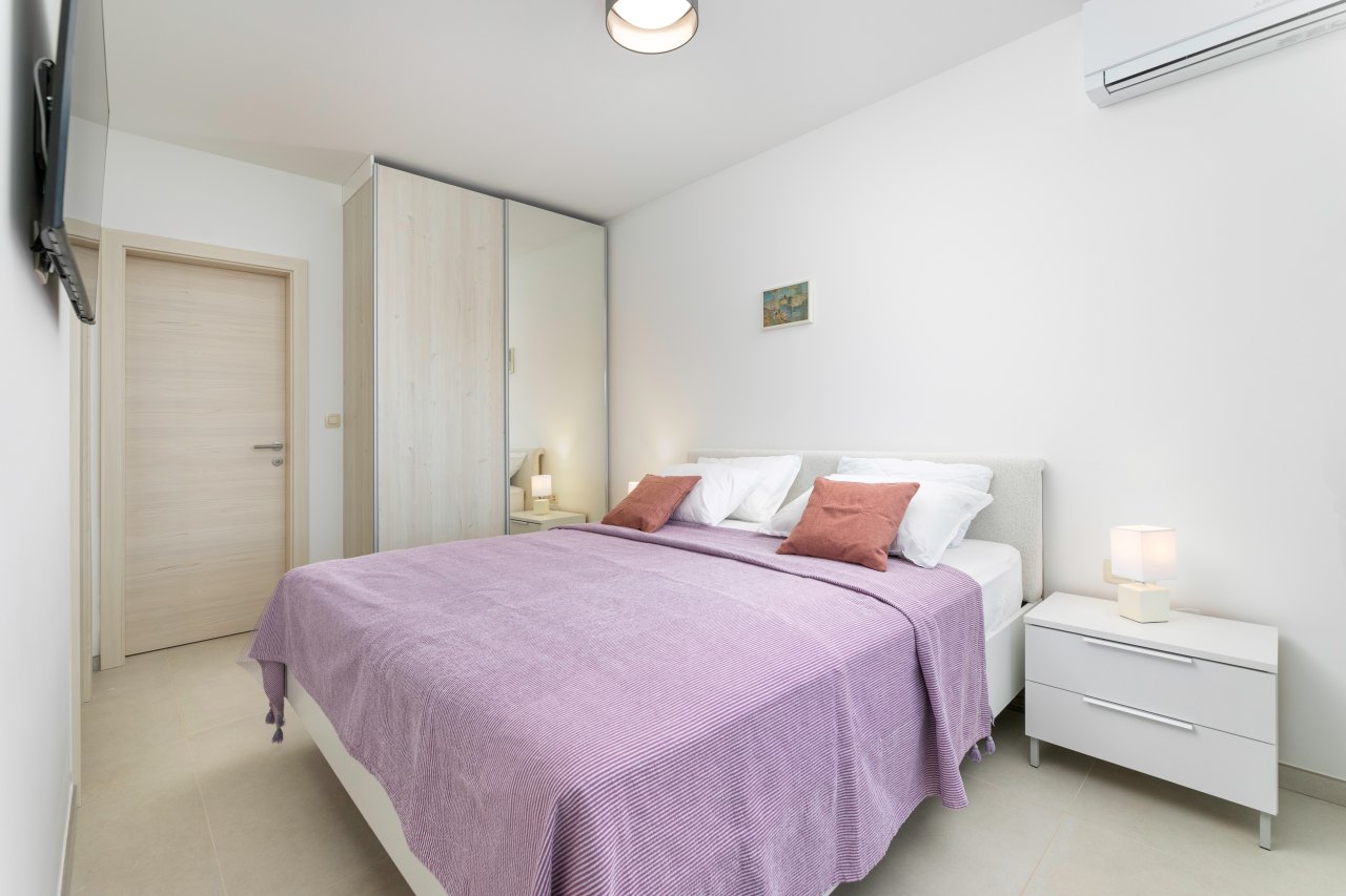 Spavaća soba : dvokrevetna soba, bračni krevet, TV, klima, pločice, krevetnina se mijenja svakih 7 dana.
