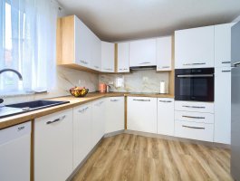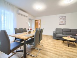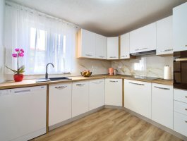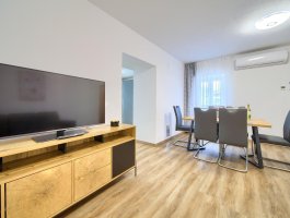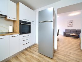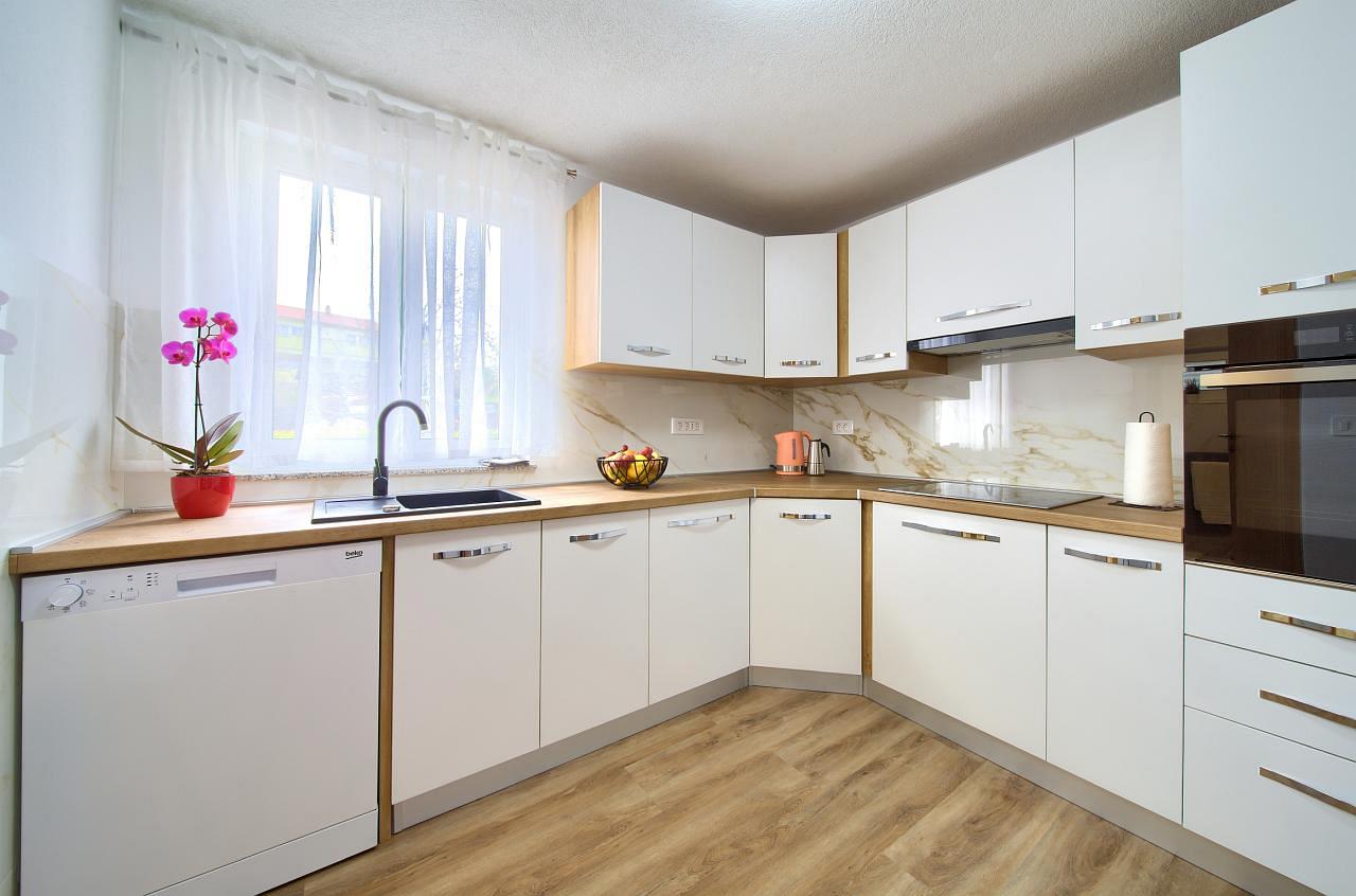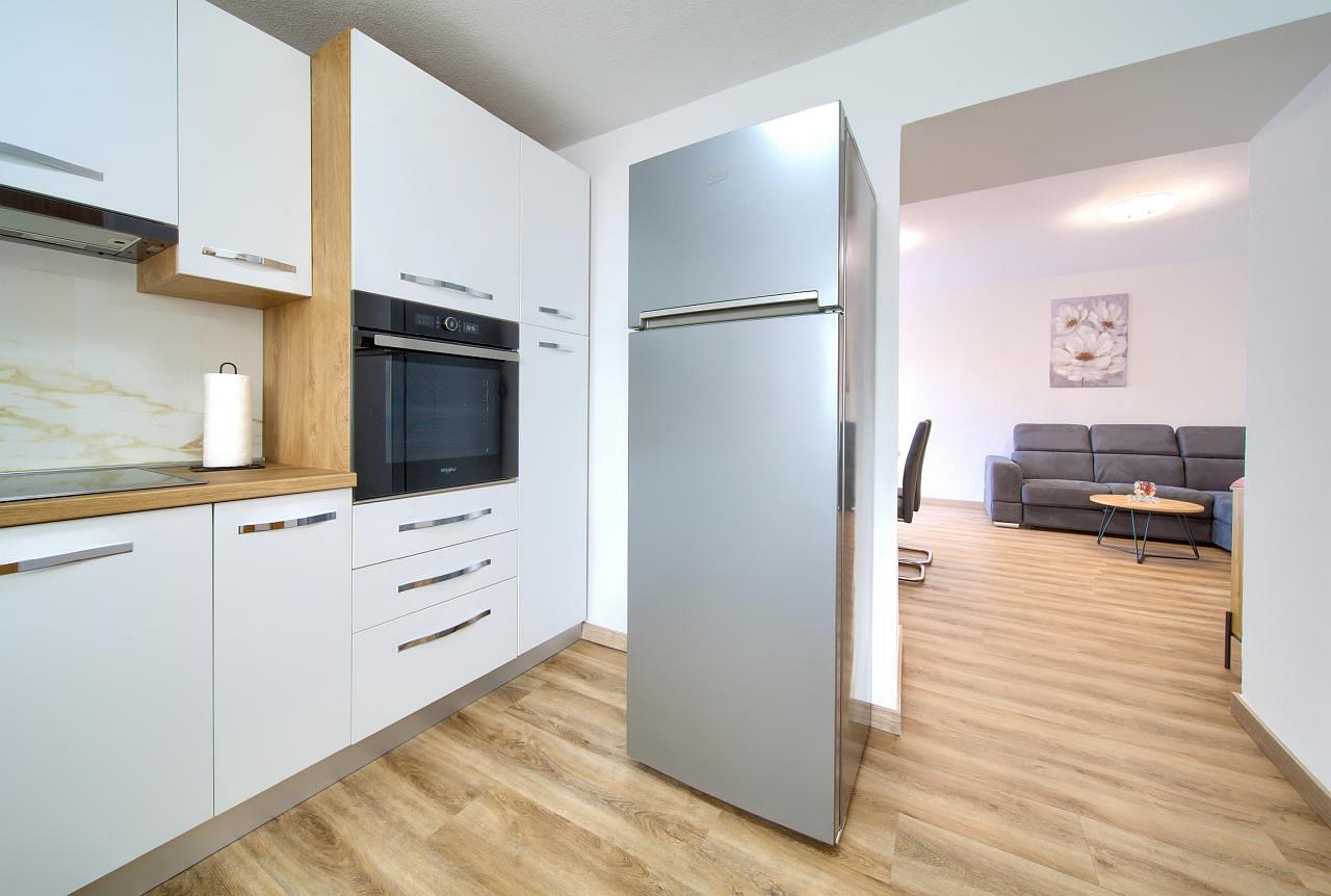 Kuhinja : kuhinjska niša, stol i stolice za sve osobe, posuđe za kuhanje te pribor za jelo u apartmanu, kuhinjske krpe uključene, električni štednjak, pećnica, hladnjak sa zamrzivačem, filter aparat za kavu, perilica suđa.