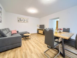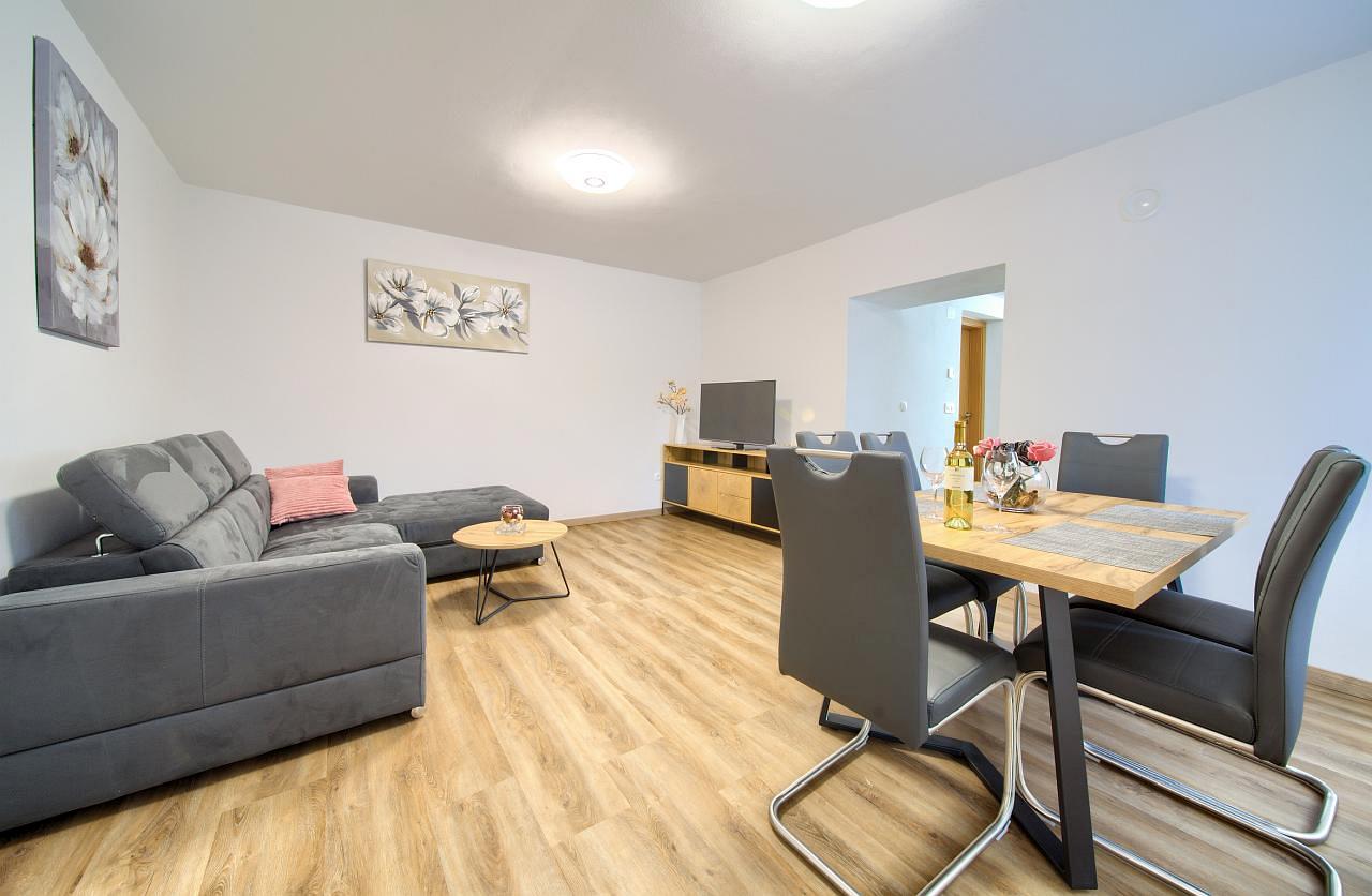 Dnevni boravak : dnevni boravak i blagovaonica su jedna soba, stol i stolice za sve osobe, jedan pomoćni ležaj, TV sat, laminat, terasa.