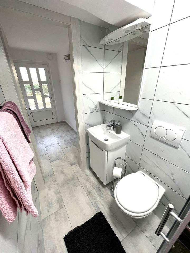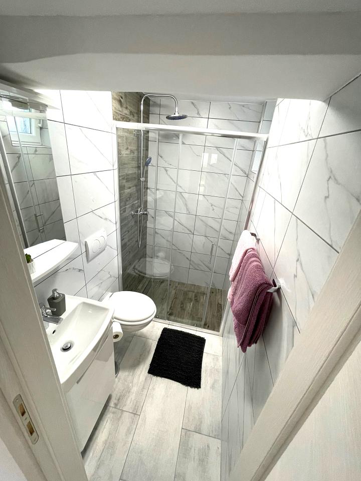 Kupaonica : kupaonica s wc-om i tušem, ručnici na raspolaganju (1 veliki, 1 mali po osobi po tjednu), fen.