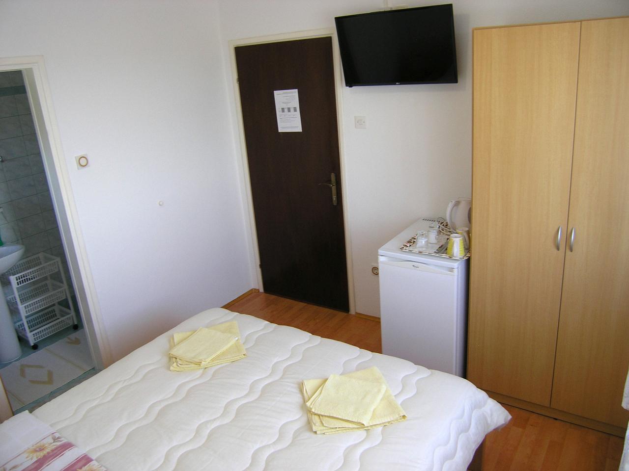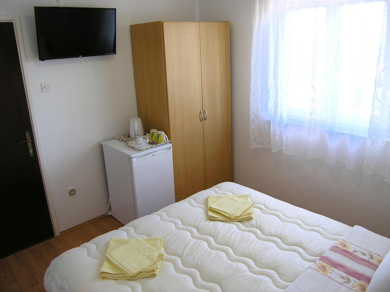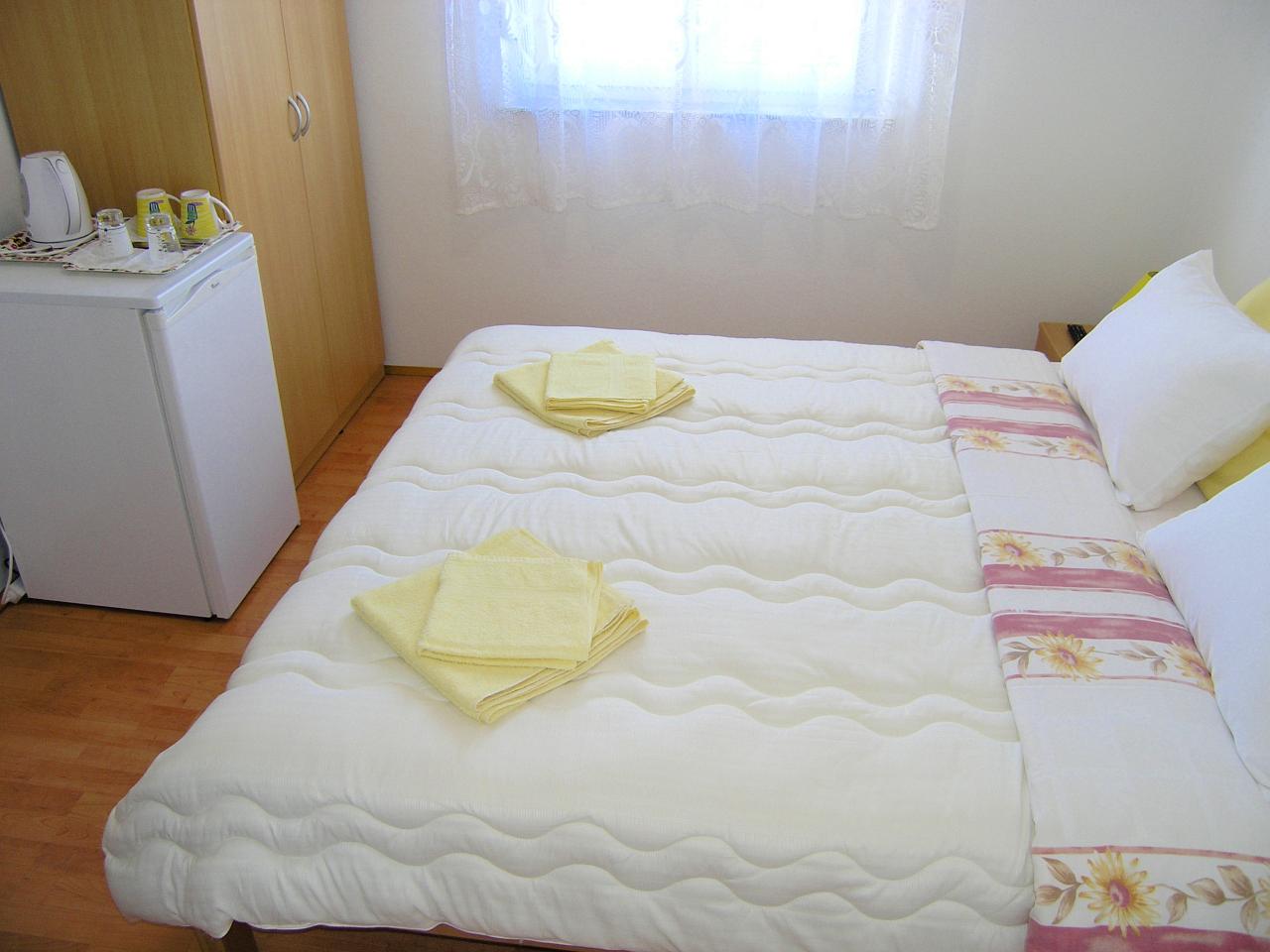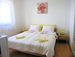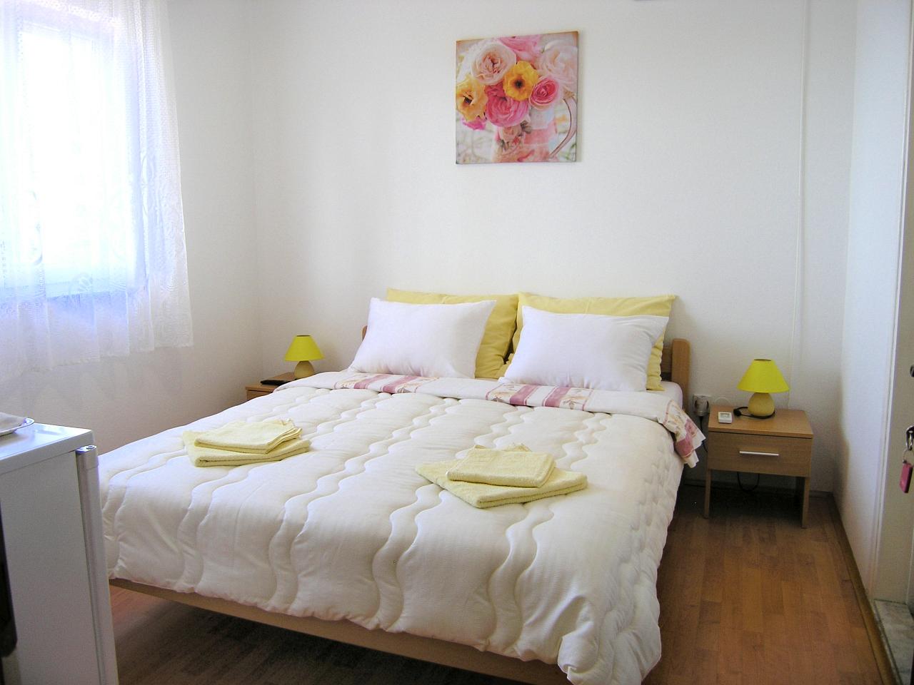 Spavaća soba: bračni krevet, mali frižider, kuhalo za vodu, čajna kuhinja, klima uređaj.