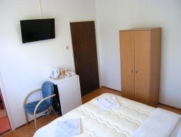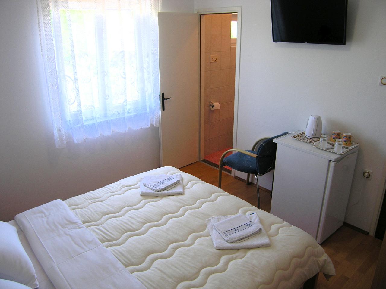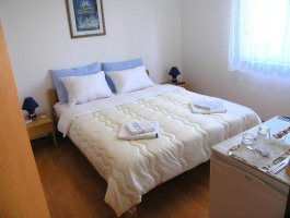 Spavaća soba: bračni krevet, mali frižider, kuhalo za vodu, čajna kuhinja, klima uređaj.