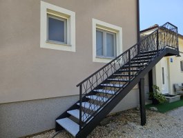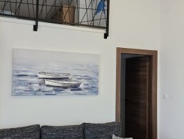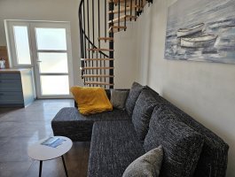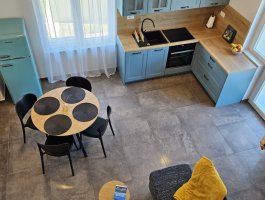 Dnevni boravak : dnevni boravak, blagovaonica i kuhinja su jedna prostorija, stol i stolice za sve osobe, kauč, TV, klima, pločice, stepenice za galeriju, balkon.