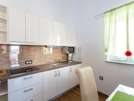 Kuhinja: stol i stolice za sve osobe, posuđe za kuhanje te pribor za jelo u apartmanu, kuhinjske krpe uključene, električni štednjak, hladnjak bez zamrzivača, filter aparat za kavu, mikrovalna , kuhinja i blagovaonica su jedna prostorija.