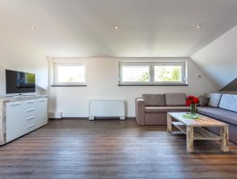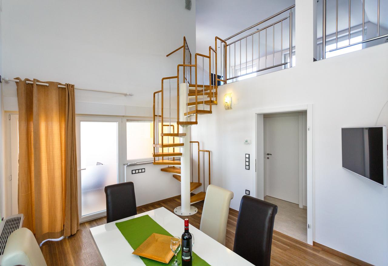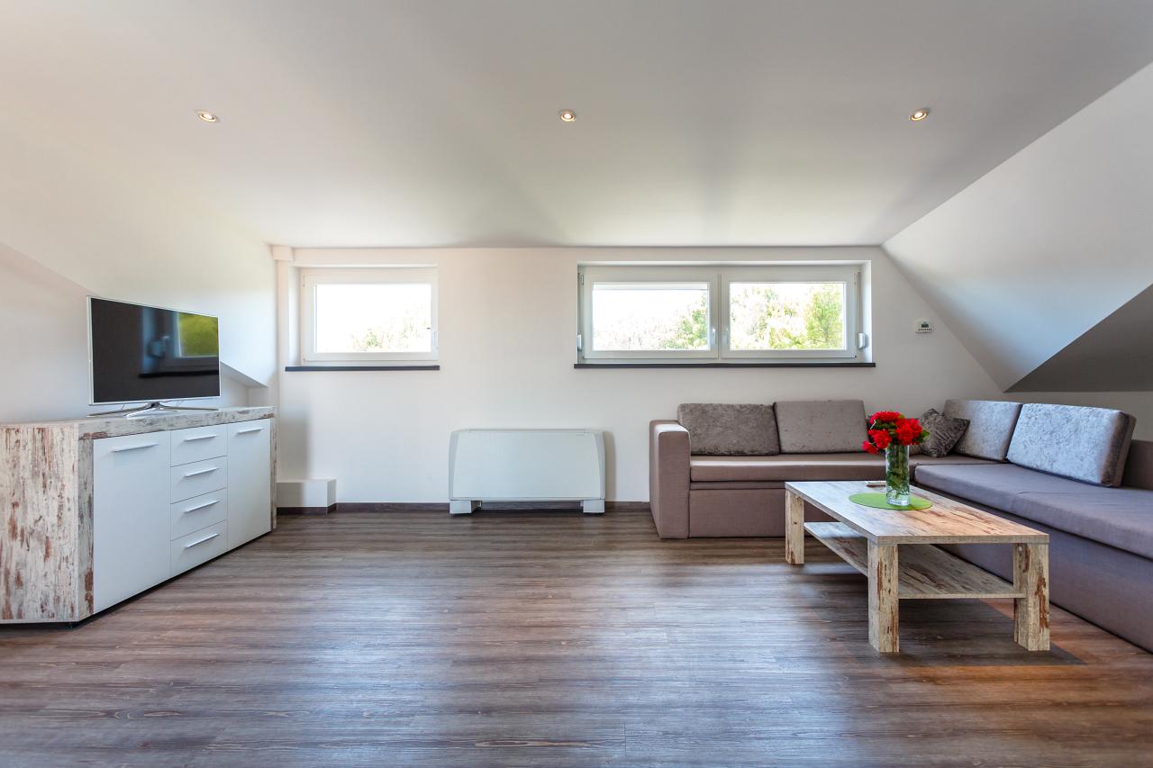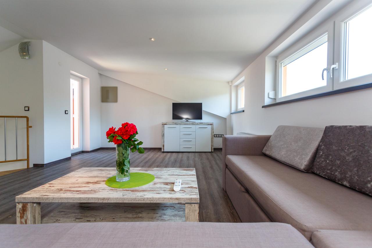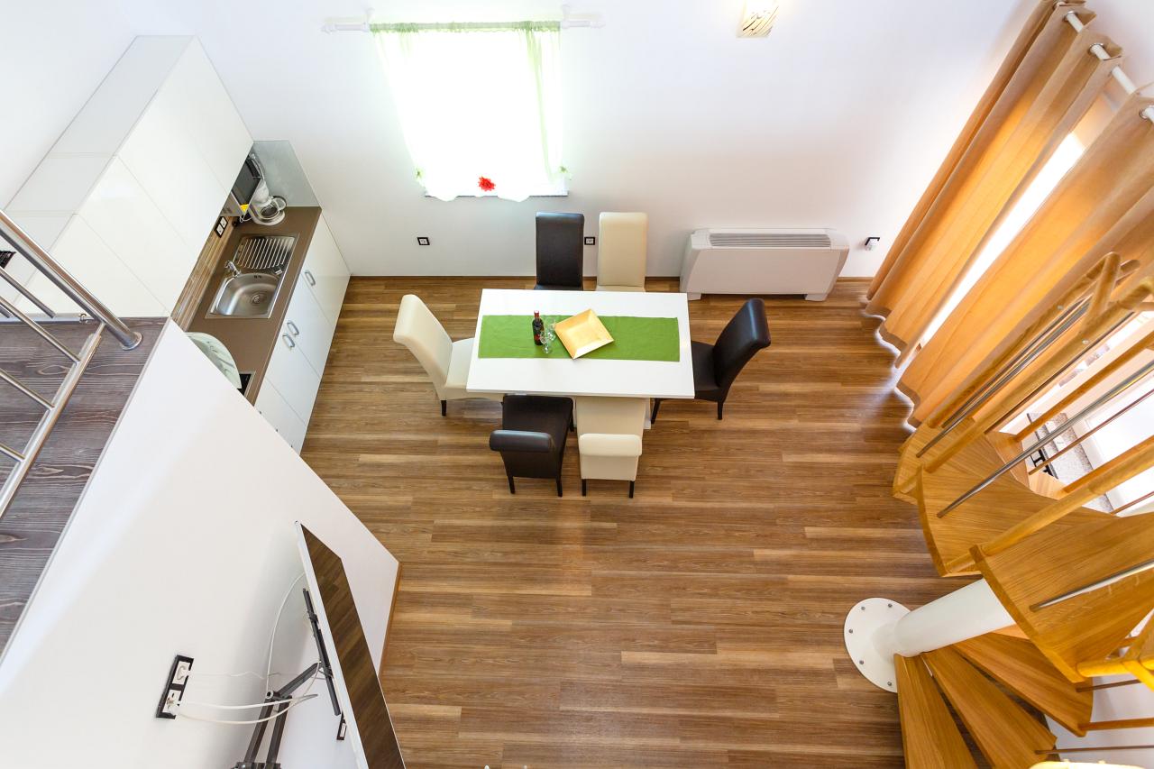 Dnevni boravak : dnevni boravak je zasebna prostorija, stol i stolice za sve osobe, kauč, TV sat, laminat, balkon s pogledom na more.