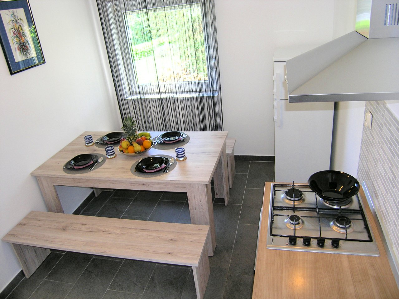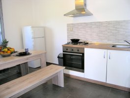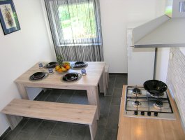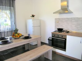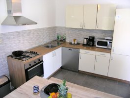 Kuhinja : stol i stolice za sve osobe, posuđe za kuhanje te pribor za jelo u apartmanu, kuhinjske krpe uključene, električni i plinski štednjak, pećnica, hladnjak sa zamrzivačem, filter aparat za kavu, mikrovalna , perilica suđa.
