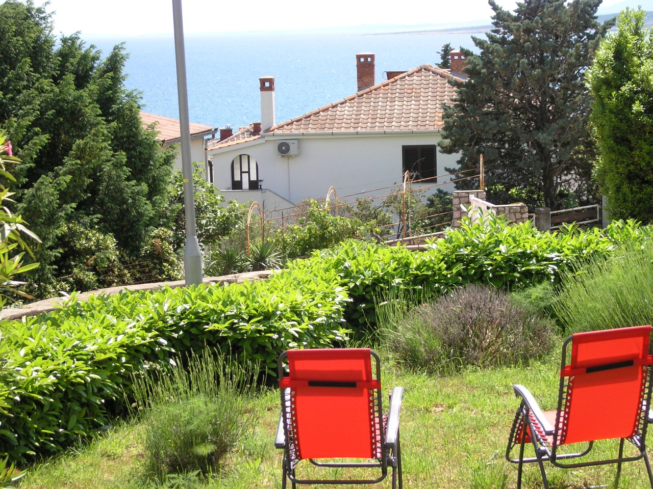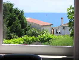 Dnevni boravak : dnevni boravak, blagovaonica i kuhinja su jedna prostorija, stol i stolice za sve osobe, pločice, s terasom, terasa s pogledom na more.