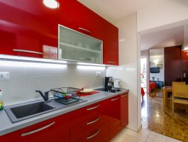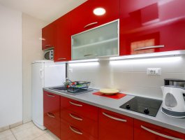 Studio (sve u jednoj prostoriji) : bračni krevet, krevetnina se mijenja svakih 7 dana , s terasom, stol i stolice za sve osobe, posuđe za kuhanje te pribor za jelo u apartmanu, kuhinjske krpe na raspolaganju, hladnjak sa zamrzivačem, električni štednjak, filter aparat za kavu, kuhalo za vodu, mikrovalna, toster, SAT-TV, parket, pločice.