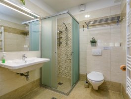 Kupaonica : kupaonica s wc-om i tušem, ručnici na raspolaganju (1 veliki, 1 mali po osobi po tjednu), perilica za rublje, sušilo za kosu.