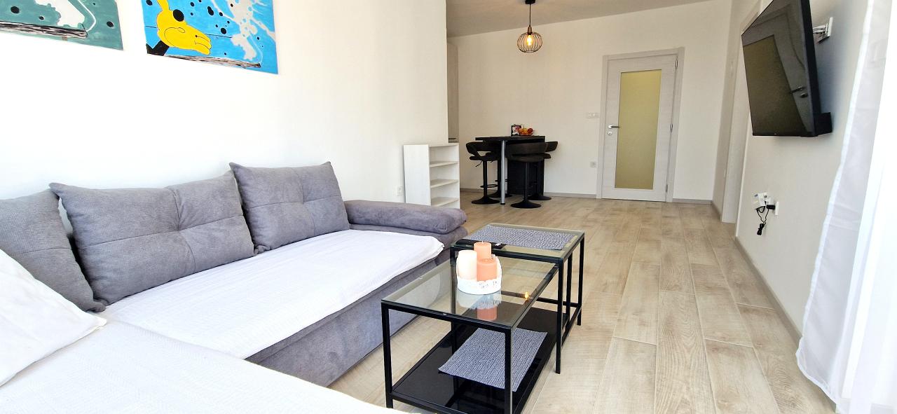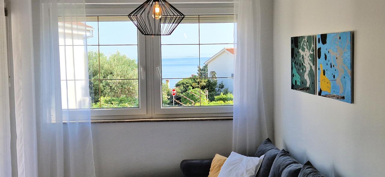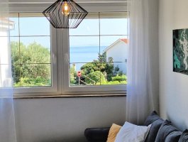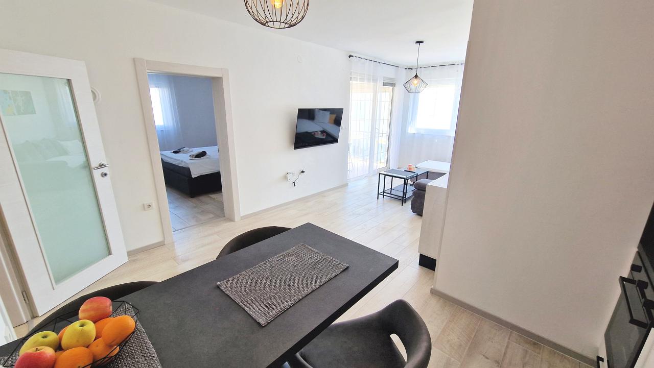 Dnevni boravak : dnevni boravak, blagovaonica i kuhinja su jedna prostorija, stol i stolice za sve osobe, TV sat, pločice , balkon s pogledom na more.