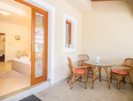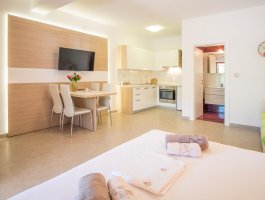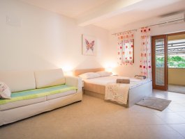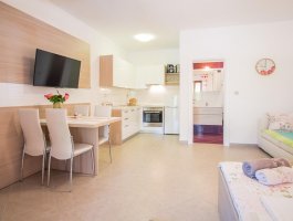 Studio (sve u jednoj prostoriji) : bračni krevet, s terasom, stol i stolice za sve osobe, kuhinjska niša, posuđe za kuhanje te pribor za jelo u apartmanu, kuhinjske krpe na raspolaganju, pećnica, hladnjak s zamrzivačem, električni štednjak, perilica za suđe, filter aparat za kavu, kuhalo za vodu, toster, SAT-TV, pločice.