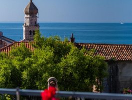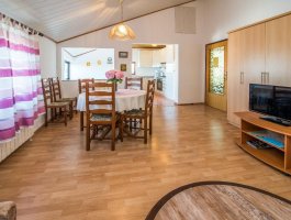 Dnevni boravak : dnevni boravak, blagovaonica i kuhinja su jedna prostorija, stol i stolice za sve osobe, kauč, TV sat, laminat, balkon s pogledom na more.