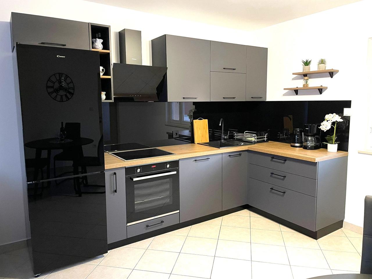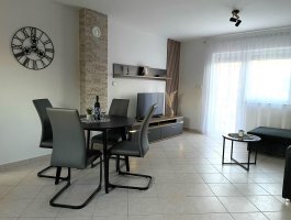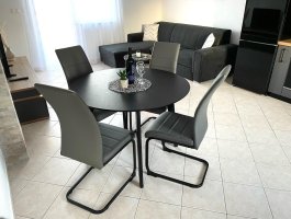 Kuhinja : stol i stolice za sve osobe, posuđe za kuhanje te pribor za jelo u apartmanu, kuhinjske krpe uključene, električni štednjak, pećnica, hladnjak sa zamrzivačem, filter aparat za kavu, kuhalo za vodu , toster, perilica suđa.