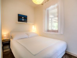 Spavaća soba : dvokrevetna soba, francuski krevet, tepih, pločice, krevetnina se mijenja svakih 7 dana.