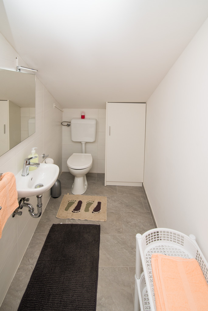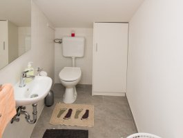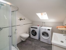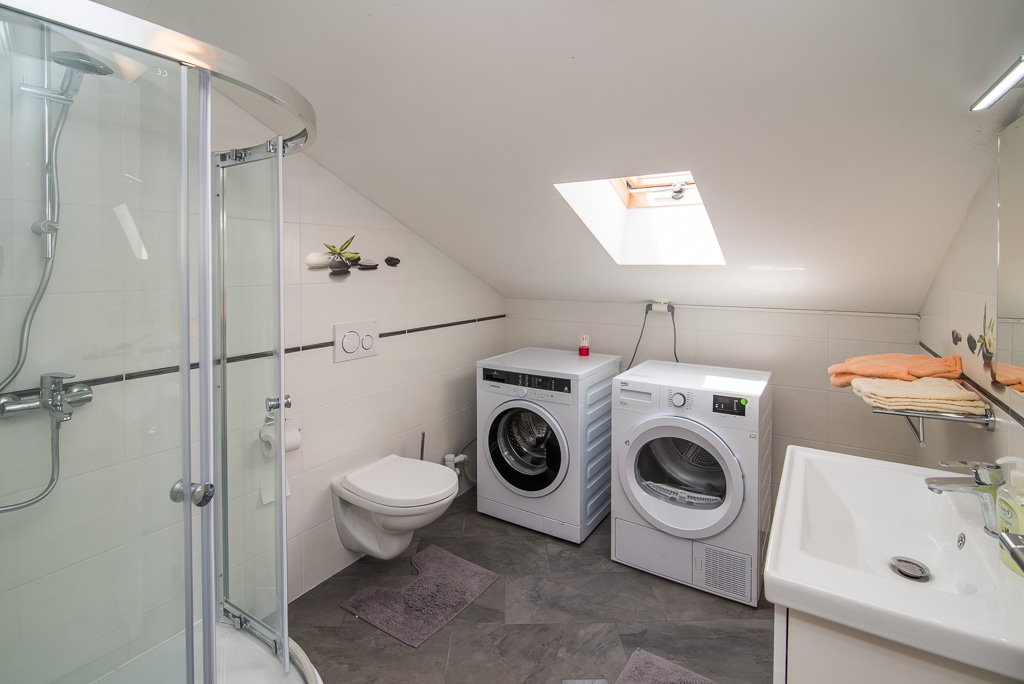 Kupaonica : kupaonica s wc-om i tušem, ručnici na raspolaganju (1 veliki, 1 mali po osobi 2 x na tjedan), perilica za robu, sušilica za robu, fen.