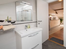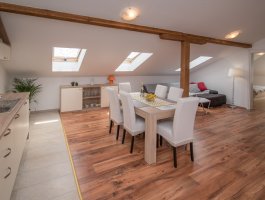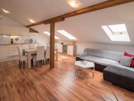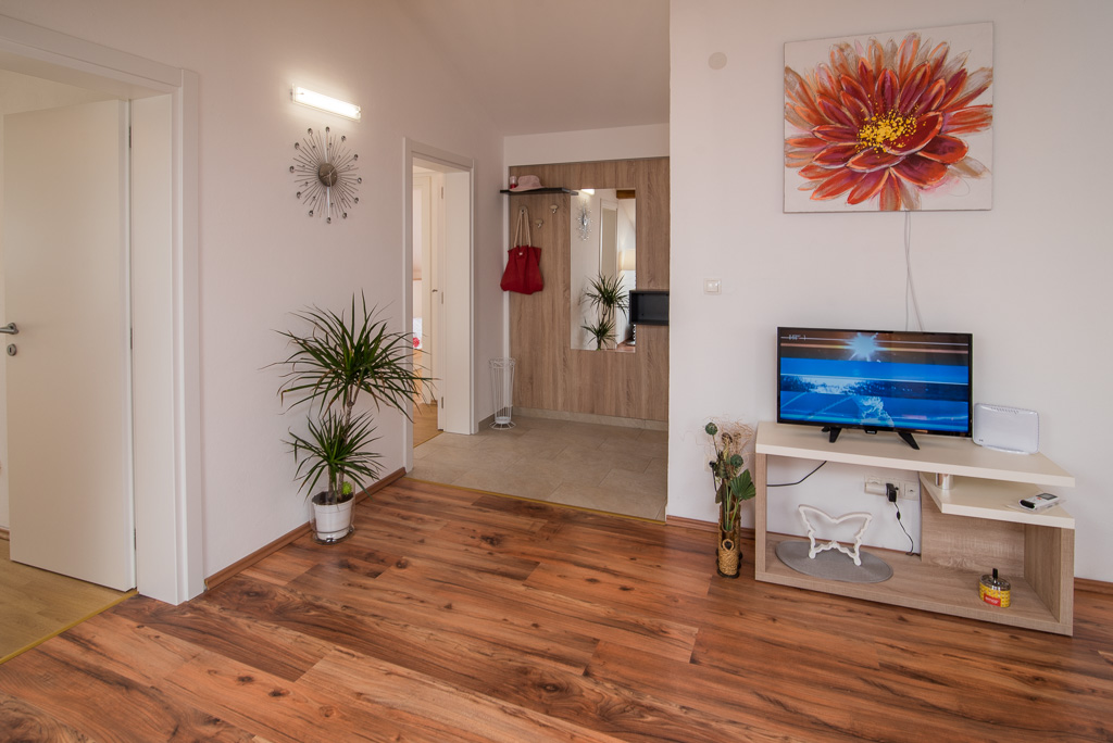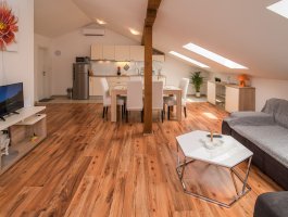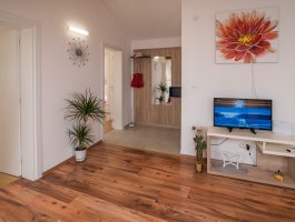 Kuhinja : kuhinjska niša, stol i stolice za sve osobe, posuđe za kuhanje te pribor za jelo u apartmanu, kuhinjske krpe uključene, električni štednjak, perilica posuđa, hladnjak sa zamrzivačem, mikrovalna pećica, kuhalo za vodu, toster.