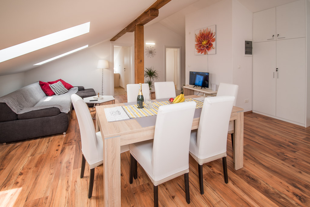 Dnevni boravak : dnevni boravak, blagovaonica i kuhinja su jedna prostorija, stol i stolice za sve osobe, laminat, TV sat.
