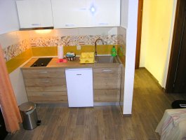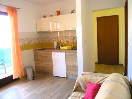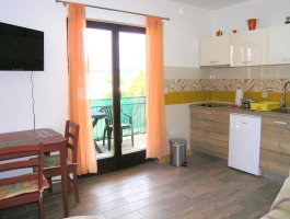 Kuhinja: kuhinjska niša, stol i stolice za sve osobe, posuđe za kuhanje te pribor za jelo u apartmanu, kuhinjske krpe uključene, električni štednjak, hladnjak s zamrzivačem, kuhalo za vodu.