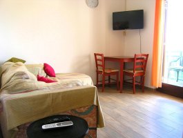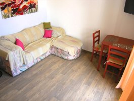 Dnevni boravak : dnevni boravak, blagovaonica i kuhinja su jedna prostorija, stol i stolice za sve osobe, TV sat, pločice, s balkonom.