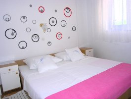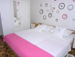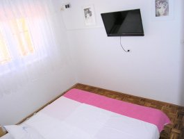 Spavaća soba : dvokrevetna soba, bračni krevet, parket, tepih, s balkonom, krevetnina se mijenja svakih 7 dana.