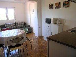 Kuhinja : kuhinjska niša, posuđe za kuhanje te pribor za jelo u apartmanu, kuhinjske krpe uključene, plinski štednjak, hladnjak s malim zamrzivačem, filter aparat za kavu, kuhalo za vodu, mikrovalna.