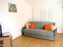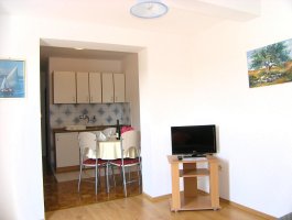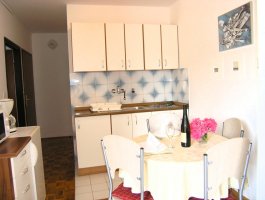 Kuhinja : kuhinjska niša, posuđe za kuhanje te pribor za jelo u apartmanu, kuhinjske krpe uključene, plinski štednjak, hladnjak s malim zamrzivačem, filter aparat za kavu, kuhalo za vodu, mikrovalna.