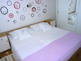 Spavaća soba : dvokrevetna soba, bračni krevet, parket, tepih, krevetnina se mijenja svakih 7 dana.