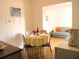 Dnevni boravak : dnevni boravak, blagovaonica i kuhinja su jedna prostorija, stol i stolice za sve osobe, kauč, TV sat, parket, pločice, s balkonom.