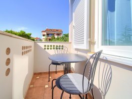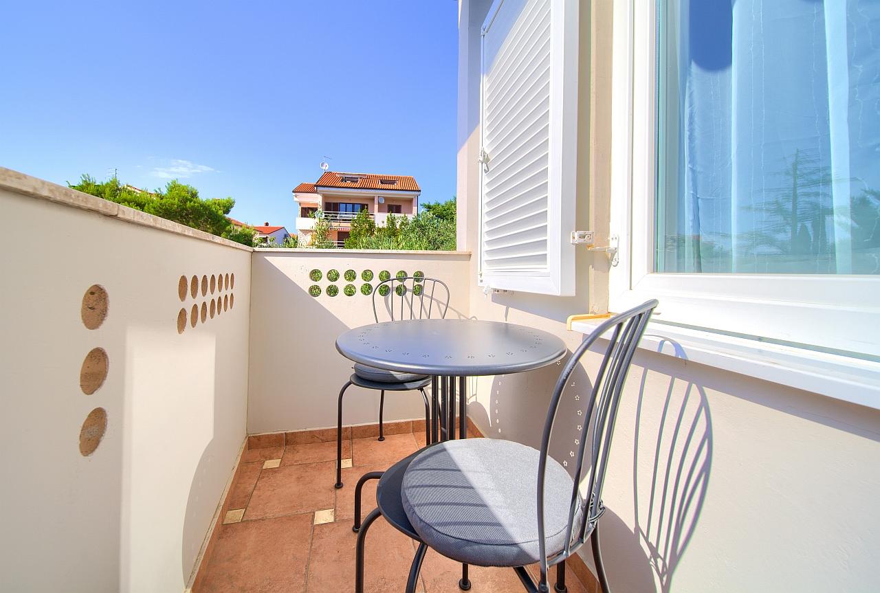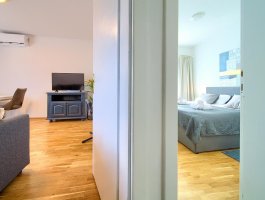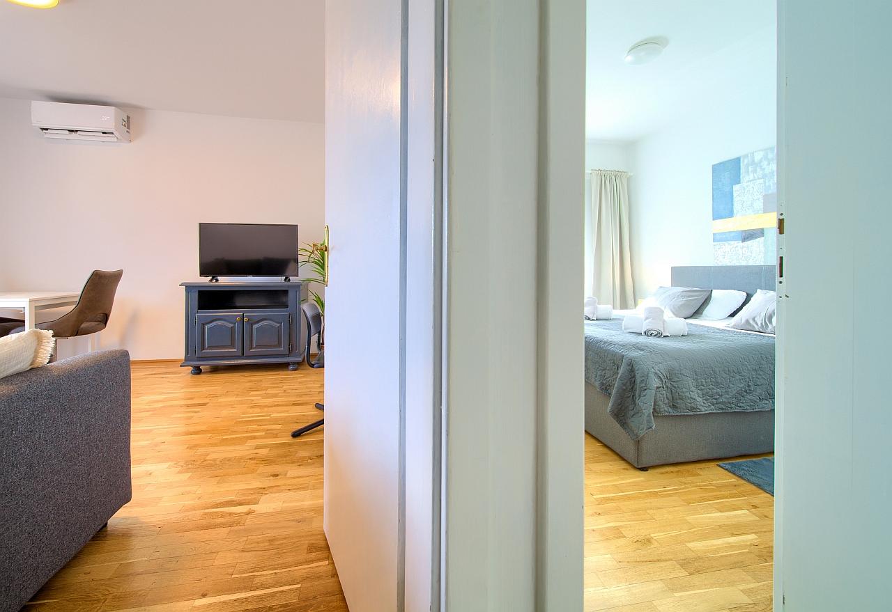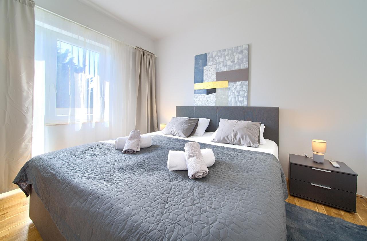 Spavaća soba : dvokrevetna soba, bračni krevet, ormar, klima, balkon, laminat, krevetnina se mijenja svakih 7 dana.