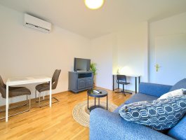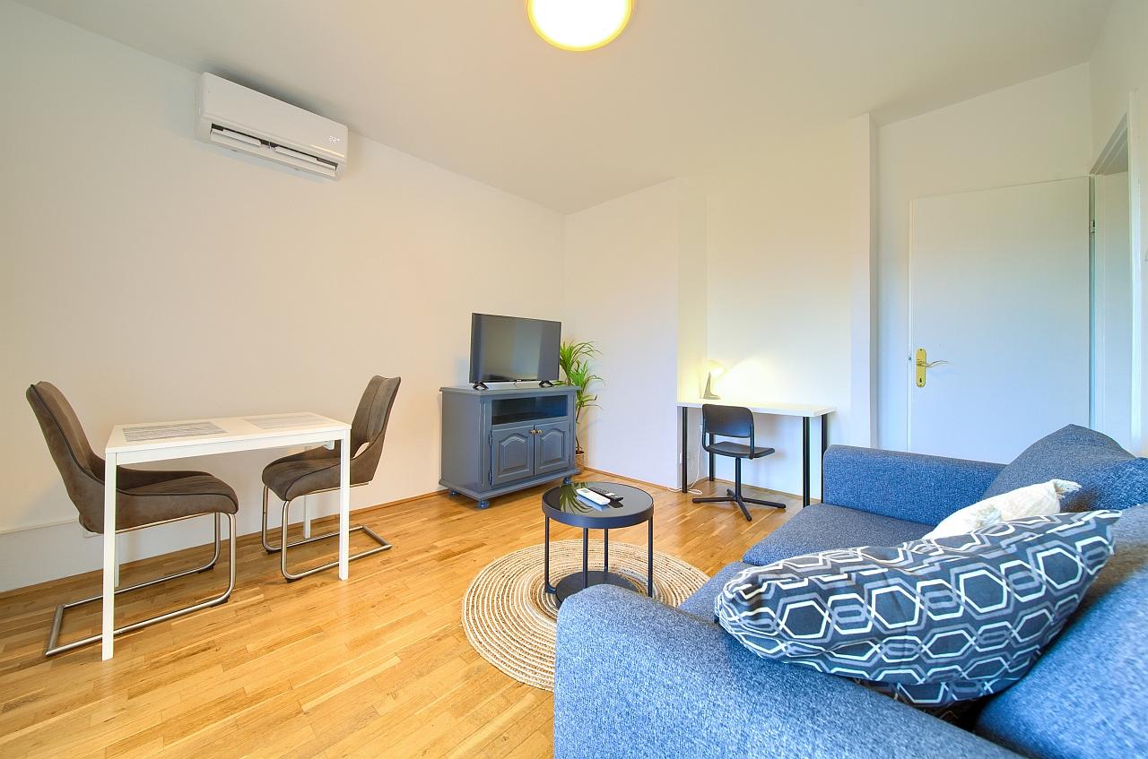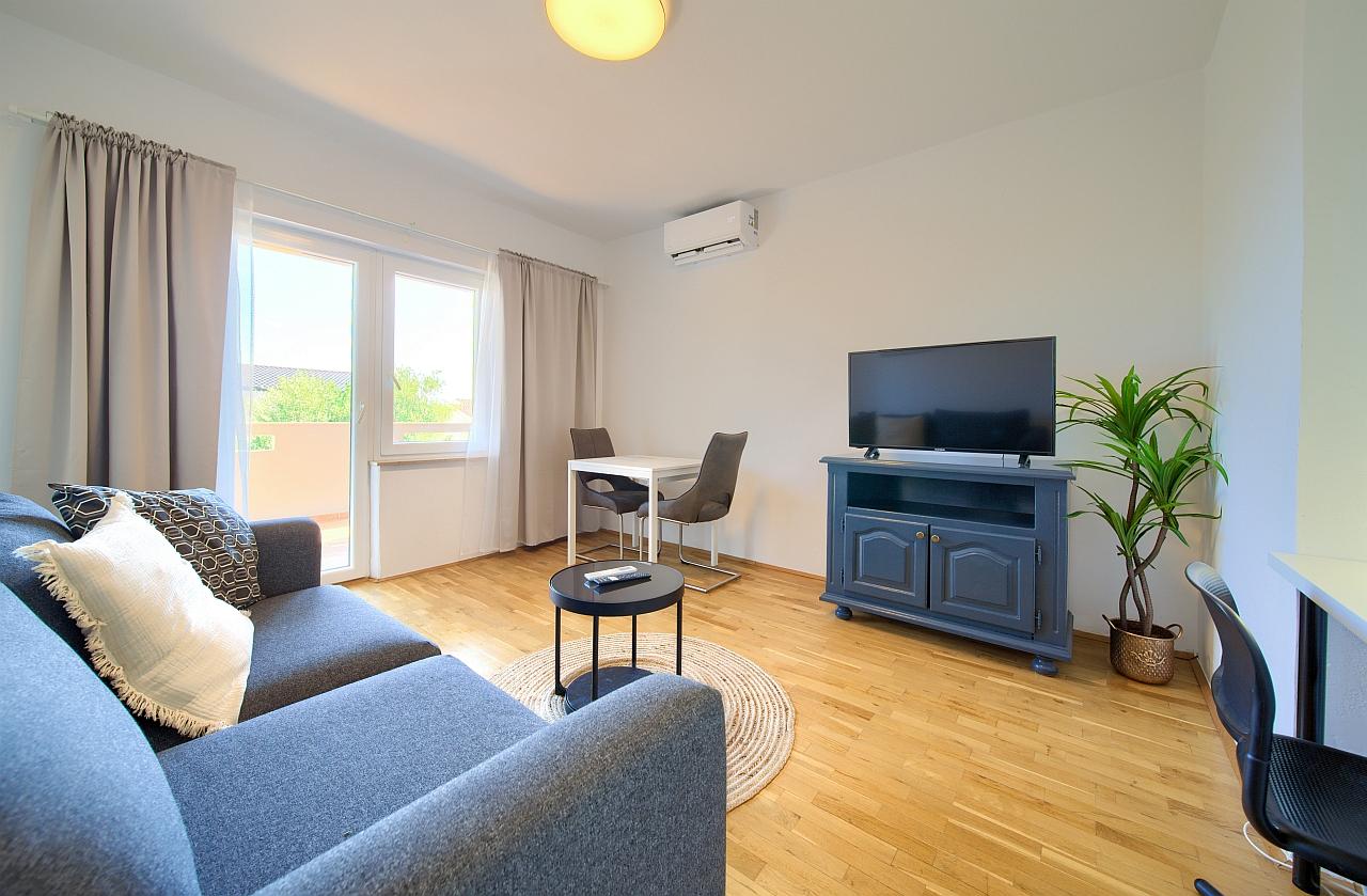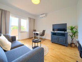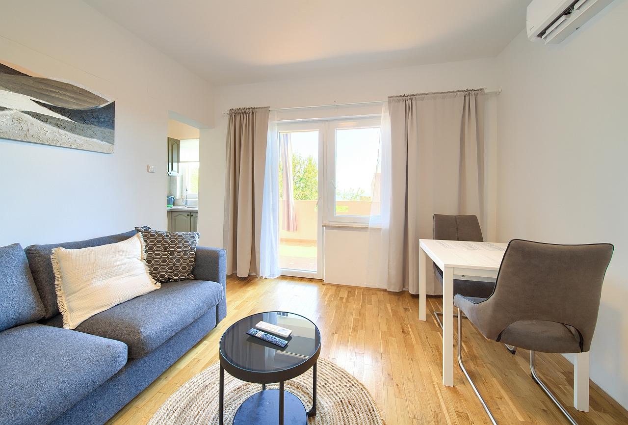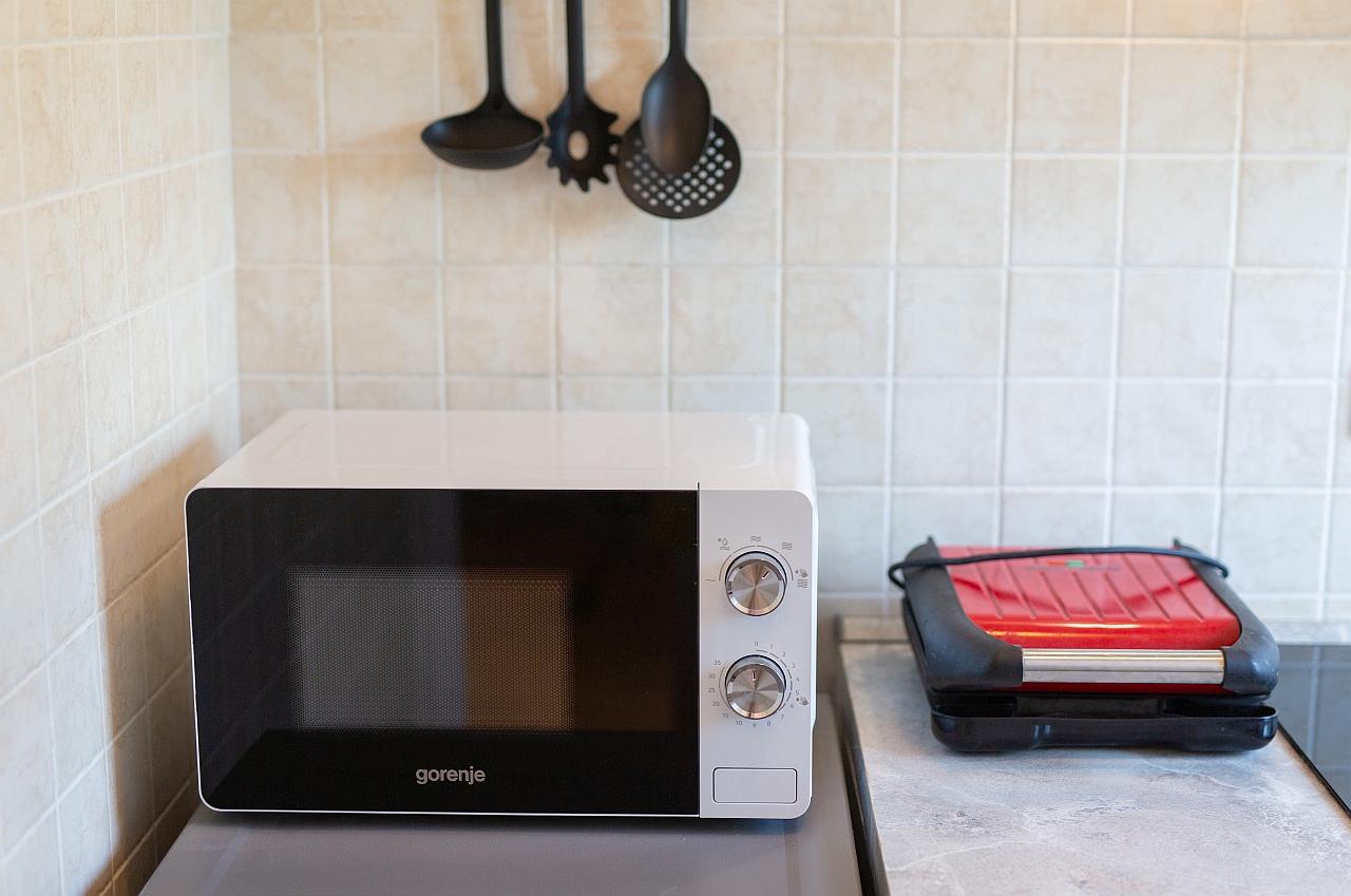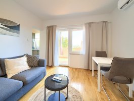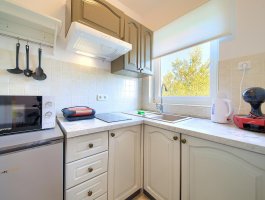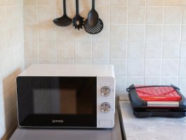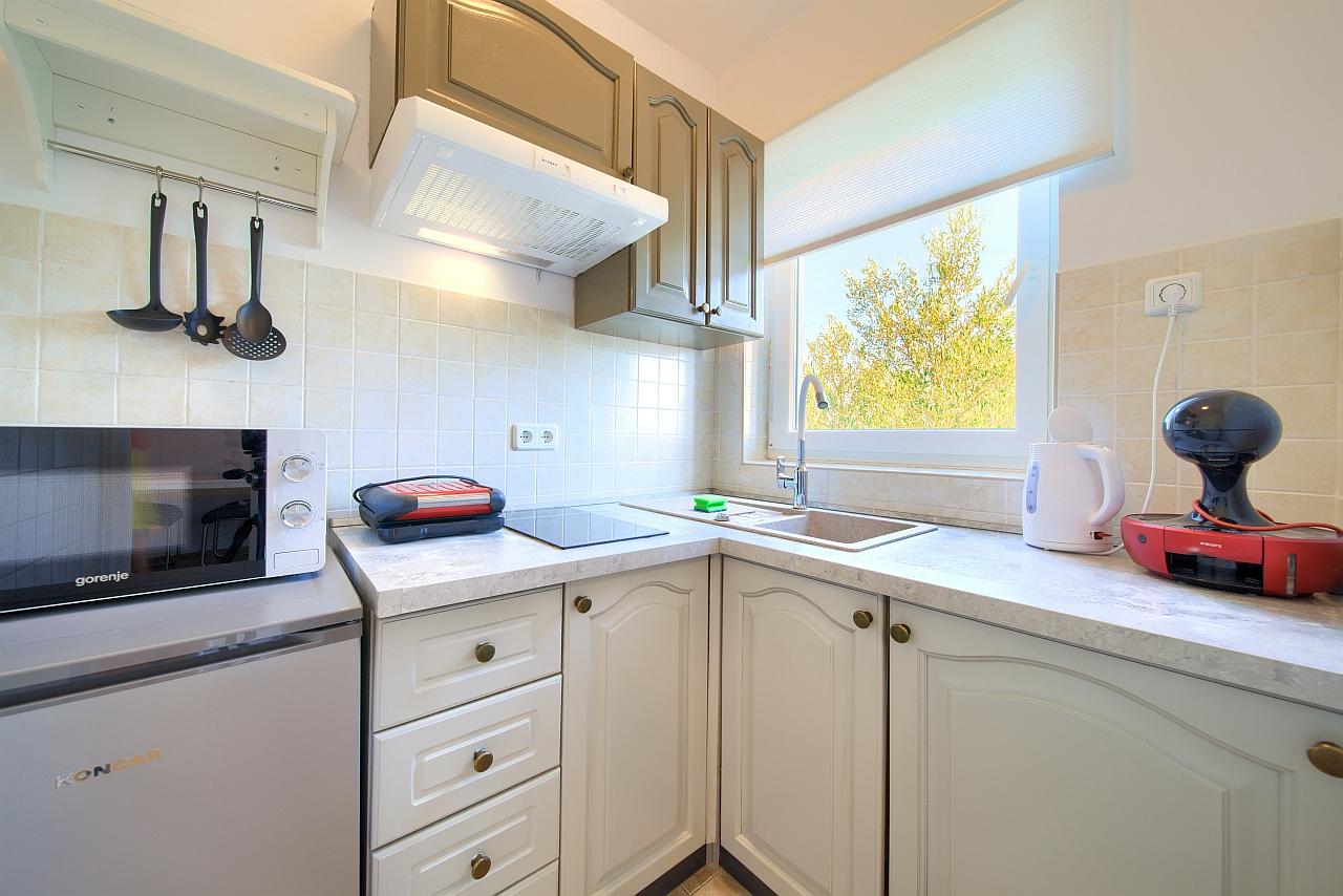 Kuhinja : kuhinjska niša, stol i stolice za sve osobe, posuđe za kuhanje te pribor za jelo u apartmanu, kuhinjske krpe uključene, električni štednjak, hladnjak s malim zamrzivačem, filter aparat za kavu, kuhalo za vodu.