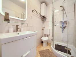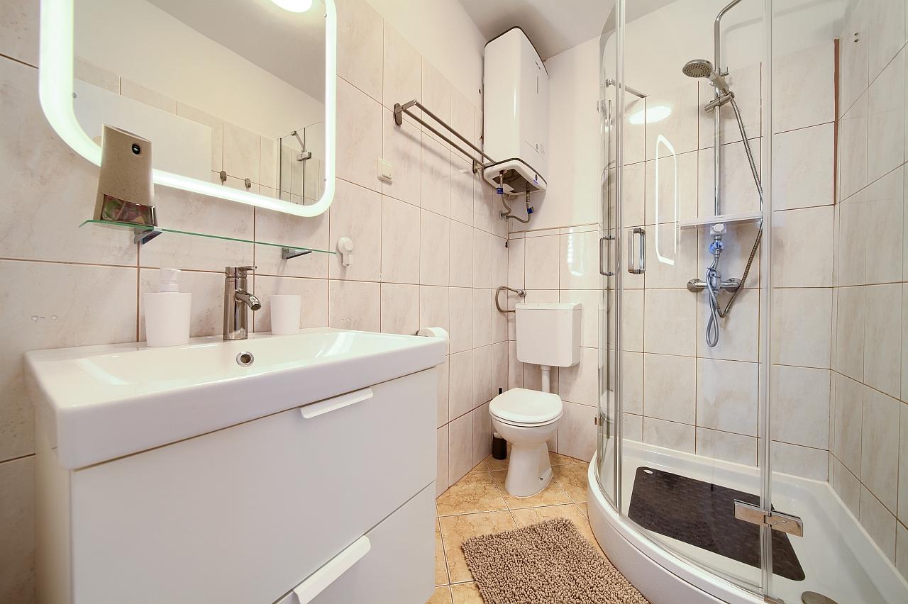 Kupaonica : kupaonica s wc-om i tušem, fen, ručnici na raspolaganju (1 veliki, 1 mali po osobi po tjednu).
