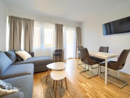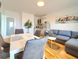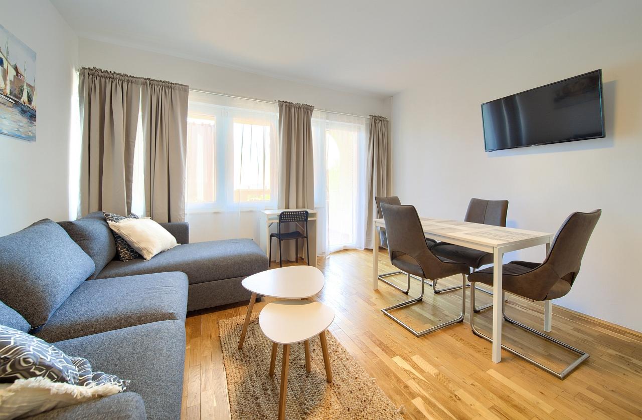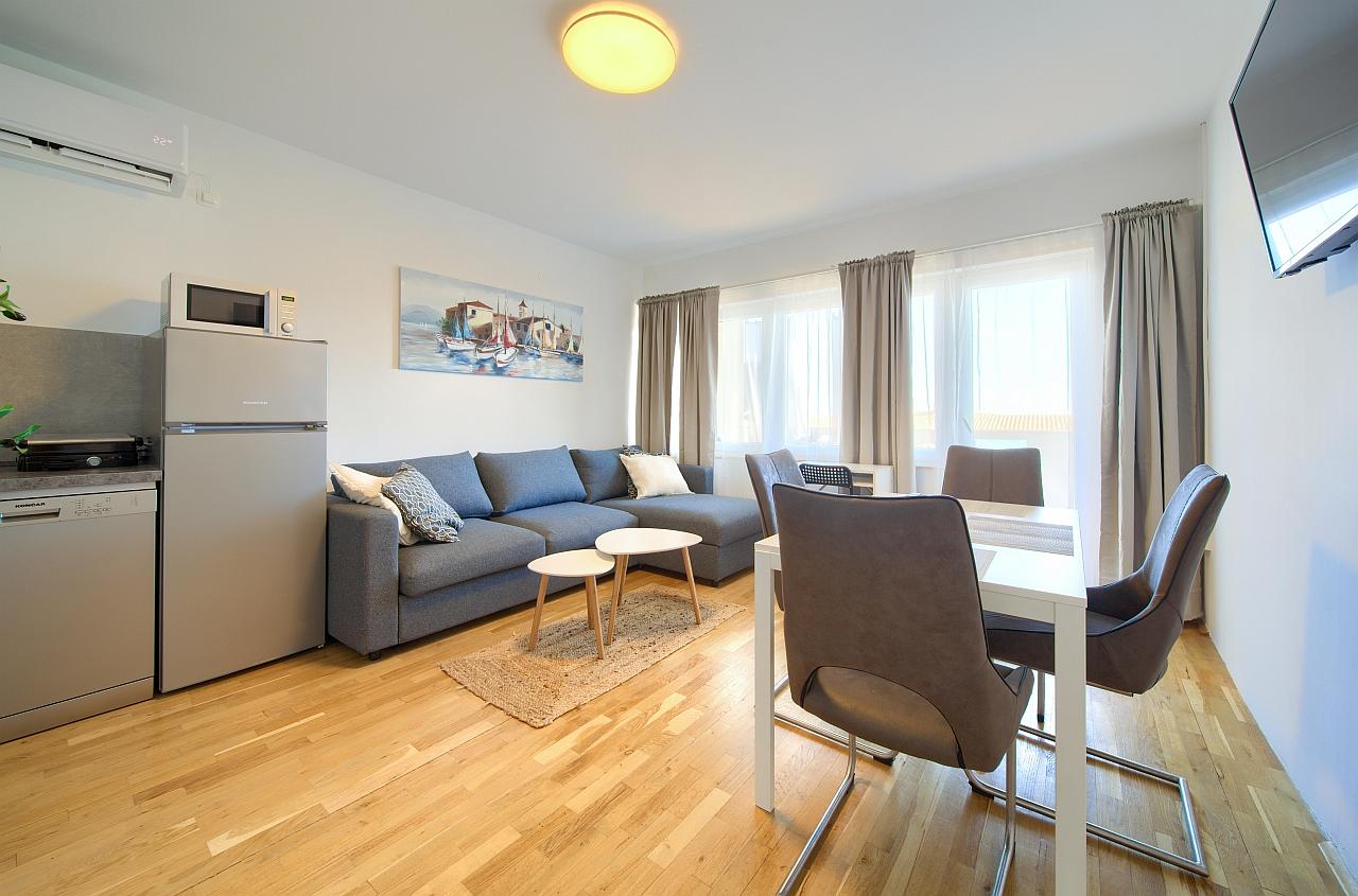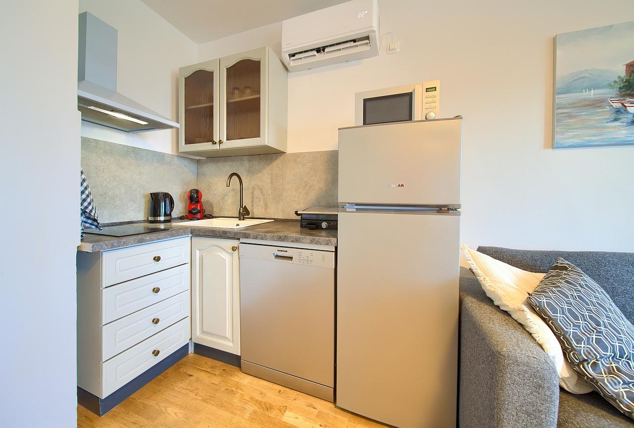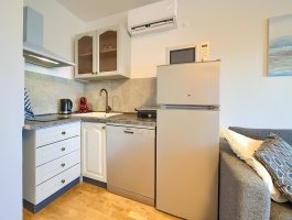 Kuhinja : kuhinjska niša, posuđe za kuhanje te pribor za jelo u apartmanu, kuhinjske krpe uključene, električni štednjak, perilica za suđe, hladnjak s zamrzivačem, mikorvalna, kuhalo za vodu, toster, aparat za kavu.