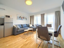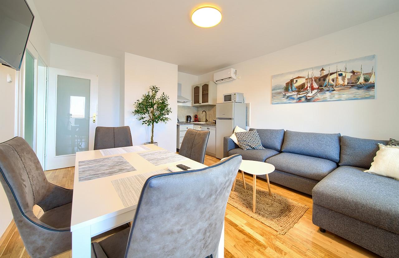 Dnevni boravak : dnevni boravak, blagovaonica i kuhinja su jedna prostorija, stol i stolice za sve osobe, kauč , TV sat, parket, pločice, balkon s pogledom na more.