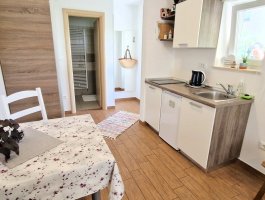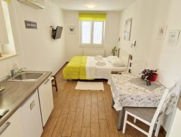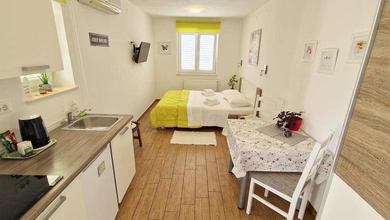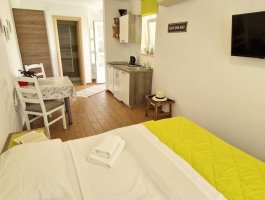 Studio (sve u jednoj prostoriji) : bračni krevet, krevetnina se mijenja svakih 7 dana, posuđe za kuhanje te pribor za jelo u apartmanu, kuhinjske krpe na raspolaganju, hladnjak s malim zamrzivačem, električni štednjak, filter aparat za kavu, kuhalo za vodu,SAT-TV, pločice.