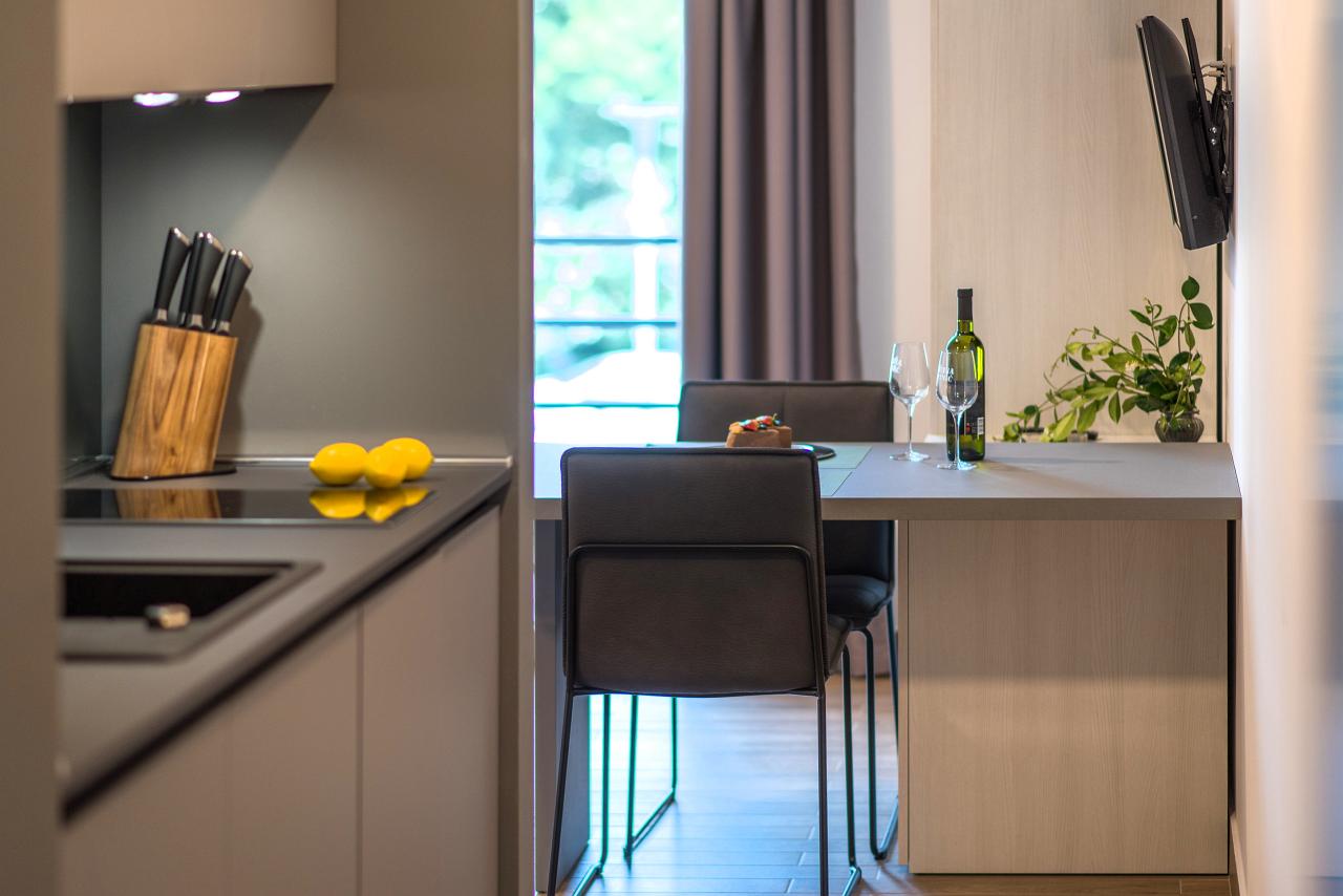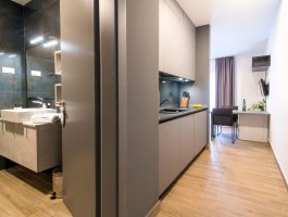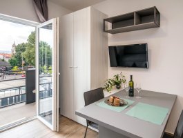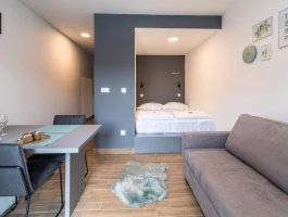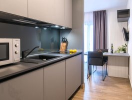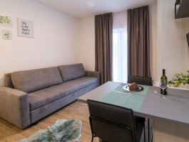 Studio (sve u jednoj prostoriji) : bračni krevet, s balkonom, stol i stolice za sve osobe, kuhinjska niša, posuđe za kuhanje te pribor za jelo u apartmanu, kuhinjske krpe na raspolaganju, hladnjak sa zamrzivačem, mikrovalna, glačalo, kauč, SAT-TV.
